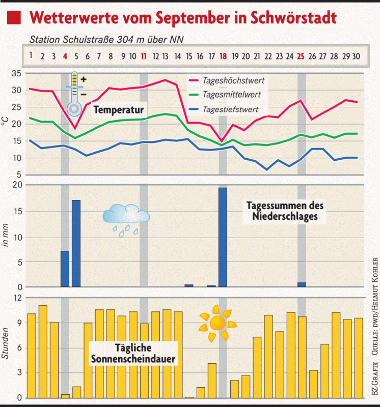 Der erste Herbstmonat begann wie der letzte Sommermonat aufgehört hatte zu warm, zu sonnig und viel zu trocken. Dieser September geht in die Wettergeschichte ein, denn noch nie seit Aufzeichnungsbeginn 1997 war ein Schwörstädter September so warm und noch nie gab es so viele Sommer- und Hitzetage. In unserer Region dürfte es nach 1947 der zweitwärmste September seit Messbeginn vor über 150 Jahren sein. Besonders in der ersten Septemberhälfte lachten die Freibadbesitzer mit der Sonne um die Wette: Strahlend blauer Himmel, sommerliche Temperaturen und kaum ein Tropfen Regen sorgten für bestes Badewetter. Im gesamten 3,4°C zu warmen und 25% zu sonnigen September fiel mit 44,8 l/m² (nach 2003 der zweittrockenste) nicht einmal die Hälfte des normalen Septemberniederschlages.