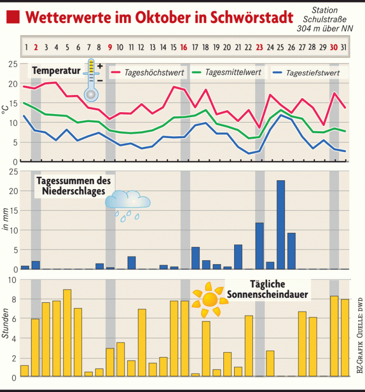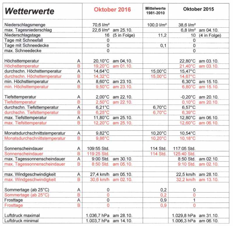 Der Oktober riss uns schlagartig aus dem ungewöhnlich warmen Spätsommer. Nach den zurückliegenden 5 zu warmen Oktobermonaten in Folge war der mittlere Herbstmonat dieses Jahr 0,4°C zu kalt, mit 70,6 l/m² fielen nur 71% des langjährigen Oktoberniederschlages und im Gegensatz zum gesamtdeutschen Oktobermittel 2016 schien die Sonne mit 119:25 Stunden 5% über dem Oktobersoll. Die 8 km von Schwörstadt entfernte und von mir betreute DWD-Station Rheinfelden war im Oktober mit 115 Sonnenstunden die sonnenscheinreichste Station sämtlicher DWD-Stationen.