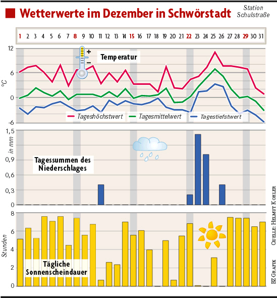 Das Wetter zu Beginn des ersten Wintermonats war von dem kräftigen Hoch „Uwe“ bestimmt, dessen Einfluss von den Britischen Inseln über Mitteleuropa bis in den Südosten Europas reichte. Allerdings ist Hochdruckeinfluss im Herbst oder Winter nicht unweigerlich mit Sonnenschein verbunden. Gegen Morgen bildeten sich ab und an lokale Nebel- oder Hochnebel. Nach deren Auflösung kamen die Sonnenliebhaber aber voll auf ihre Kosten, allerdings mussten sie sich bei verbreitet leichten bis mäßigen Nachtfrösten auch dick einpacken. Hoch „Uwe“ war bis zum 10. Dezember wetterbestimmend, so verzeichneten wir in der absolut niederschlagsfreien und 1,2°C zu kalten ersten Dezemberdekade mit 62 Stunden schon 142% der normalen gesamten Dezember-Sonnenscheindauer. Nach 13 niederschlagsfreien Tagen in Folge sorgte Tief „Vita“ am Morgen des 11. für 0,4 l/m² Regen, der auf dem gefrorenen Boden stellenweise für tückisches Glatteis sorgte. Ab dem 12. Dezember war jedoch wieder alles beim alten, Hoch „Wolfgang“ sorgte mit Nebel, Hochnebel, Sonne und Nachtfrösten für trockenes Winterwetter. In der ersten 1,1°C zu kalten Dezemberhalbzeit fiel mit 0,4 l/m² erst 0,4% des Dezember-Niederschlagssolls und mit 87 Sonnenscheinstundenverzeichneten wir schon 197% der langjährigen gesamten Dezember-Sonnenscheindauer.Mit Hoch „Xander“ startete auch die 2. Dezemberhalbzeit bis zum 22. mit ruhigem, trockenem und recht sonnigem vorweihnachtlichem Hochdruckwetter. In der Nacht auf den 23. kamen wir in den Einflussbereich der Tiefs „Antje“ und „Barbara“. Nach 25 Frosttagen in Folge war der 23. Dezember wieder frostfrei. Die mit einer westlichen Strömung eingeflossene milde Meeresluft hielt sich mit unbeständigem Wetter und kurzen Regenschauern über die ganzen Weihnachtsfeiertage. So benötigte der Weihnachtsmann auch dieses Jahr wieder Rollen unter seinem Schlitten. Nach einer mageren Weihnachts-Niederschlagsausbeute von 3 l/m² nahm ab dem 27. Dezember das mächtige Hoch „Yörn“ das Zepter in die Hand. Bis zum Jahresende konnten wir das sehr sonnige und trockene Winter-Hochdruckwetter genießen, wobei wir am 27. mit 1.045,8 hPa. den höchsten Luftdruck seit Messbeginn verzeichneten.