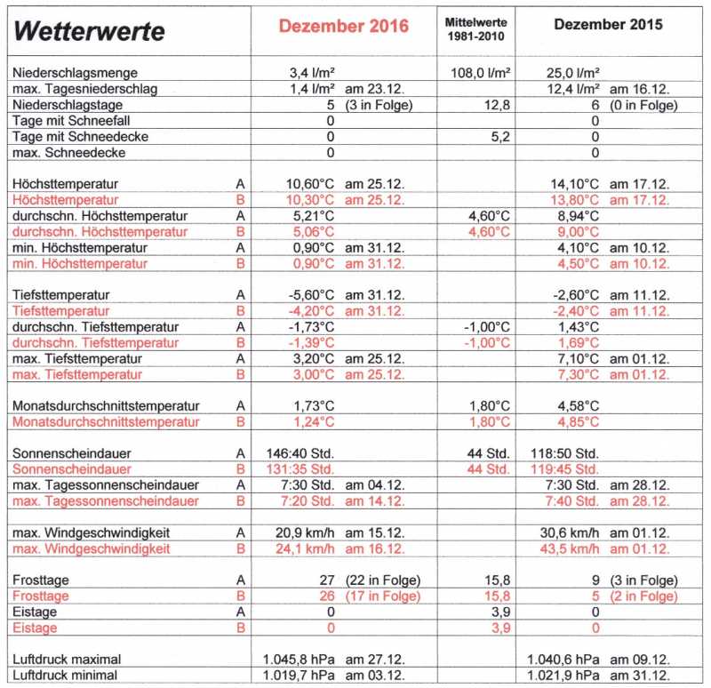 Der Dezember 2016 geht in die Wetter-Geschichtsbücher ein, denn noch nie seit über 150 Jahren gab es am Hochrhein solch einen niederschlagsarmen und sonnenscheinreichen Dezember. Der 0,8°C zu kalte erste Wintermonat lag mit 146:40 Sonnenstunden deutlich über dem 3-fachen (333,3%) der normalen Dezember-Sonnenscheindauer, mit nur 3,4 l/m² verzeichneten wir nur gerade 3,1% des langjährigen Dezember-Niederschlages und noch nie in den letzten 50 Jahren stieg das Barometer in Schwörstadt auf 1.045,8 hPa. an.