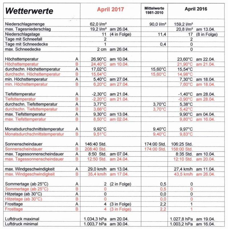 Unter dem Einfluss von Hoch „Marrit“ und Tief „Johnny“ startete der April mit einem Wechsel von Sonne und Wolken ca. 2°C zu warm. Nach 10 niederschlagsfreien Tagen in Folge brachte ein Höhentief am Abend des 3. April ein kurzes Gewitter mit 4 l/m² Regen. Die folgenden 4 Tage blieb es dann bei weiterhin mildem, typisch wechselhaftem Aprilwetter. Nach einer sternenklaren Nacht war am Morgen des 7. April mit einer 2-Metertemperatur von 0,7°C und einer 5 cm Bodentemperatur von –1,5°C bei den Laternenparkern Eiskratzen angesagt. Bis zum 10. bescherte uns dann Hoch „Ortrud“ sehr sonniges und warmes Hochdruckwetter. Am 9. April hatten wir mit 26,7°C den ersten Sommertag (ab 25°C) des Jahres und einen Tag später mit 26,9°C den bisher wärmsten Tag des Jahres. Mit Hoch „Pia“ und leichtem Einfluss der Tiefs „Marcel“ und „Norbert“ gingen die Temperaturen vom 11. bis Karsamstag 15. April leicht zurück, mit viel Sonnenschein lagen sie aber immer noch deutlich über dem langjährigen Aprilniveau. Nach 9 niederschlagsfreien Tagen in Folge brachte uns Tief „Otto“ am Karsamstag 1,4 l/m² Regen. Somit war die 1. Aprilhalbzeit 2,8°C zu warm, mit 6,2 l/m² fiel erst 7% des normalen Aprilniederschlages und mit 113 Stunden schien die Sonne schon 65% der langjährigen gesamten April-Sonnenscheindauer. Ganz nach dem Motto „April, April, der macht was er will“ sorgten Tief „Peter“ und Hoch „Querida“ bei sukzessiv sinkenden Temperaturen für einen wechselhaften Start in die 2. Aprilhälfte. Nach abendlichen Schneeschauern sank in der Nacht zum 20. April die Temperatur auf –2,2°C ab, am Morgen des 21. April war es mit –2,3°C so fortgeschrittenen Vegetation entstanden große Frostschäden. So wurden in der Region zum Beispiel Obstplantagen und Weinreben zu 100% geschädigt. Im Zusammenspiel mit Hoch „Querida“ und Tief „Quentin“ blieb es dann bis zum 24. April sehr sonnig und trocken, so stieg die Temperatur am 24. nochmals auf 22°C an. Tief „Reiner“ brachte uns mit einer Kaltfront am 25. den Anfang vom Ende des Frühlingswetters. Nach starken Schneefällen hatten wir am Morgen des 26. April bei 0,4°C mit 2 cm die höchste Schneedecke für Ende April der letzten 20 Jahre. Mit einer 4-tägigen Niederschlagsausbeute von 43,2 l/m² wurde das Niederschlagsdefizit etwas abgeschwächt, aber es wurden erst 69% des normalen Aprilsolls erreicht. Mit den Hochs „Sonja“ und „Rosalie“ zeigten sich die letzten beiden Apriltage mit einem Temperaturaufschwung wieder sehr sonnig und niederschlagsfrei.