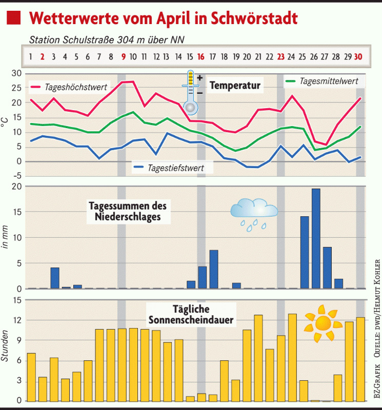 Der April ist eben ein launischer Monat, nicht umsonst prägte der Volksmund den Begriff "Aprilwetter" und der diesjährige April bestätigte diesen Begriff wieder einmal voll und ganz. Von frühlingshaftem Wohlfühlwetter über sommerliche Wärme in der ersten Monatshälfte bis zum winterlichen Frost mit Schneefall in der zweiten Halbzeit hatte der diesjährige April das gesamte Wetterrepertoire im Gepäck. Trotz einer viel zu kalten zweiten Aprilhälfte war der mittlere Frühlingsmonat in Schwörstadt gegenüber der Norm von 1981 bis 2010 mit einem Sonnenscheinüberschuss von 35 Stunden 0,5°C zu warm und 28 l/m² zu niederschlagsarm.