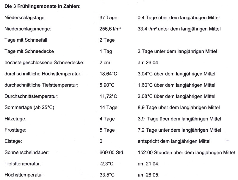 Noch nie seit Beginn der systematischen Wetteraufzeichnungen vor über 150 Jahren war ein März wärmer. Mit 11,6 l/m² zu viel Niederschlag und einem Sonnenscheinüberschuss von 67:35 Stunden war der erste Frühlingsmonat mit einer Durchschnittstemperatur von 9,5°C (Norm 5,7°C) gemeinsam mit dem März 1994 der wärmste März seit Aufzeichnungsbeginn.