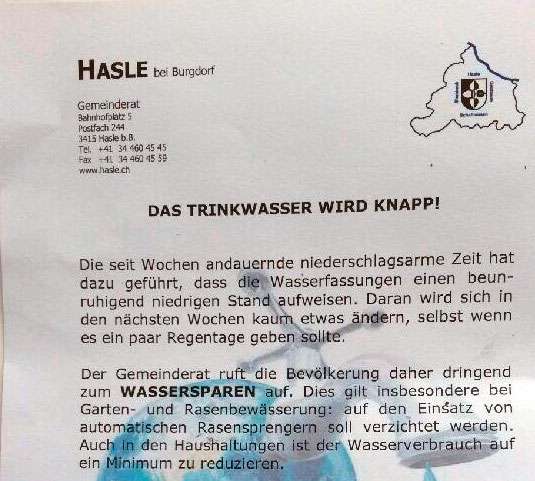 «Der Gemeinderat ruft die Bevölkerung dringend zum Wassersparen auf», heisst es in dem Schreiben an die Einwohner von Hasle. Auf den Einsatz von automatischen Rasensprengern soll verzichtet werden. Auch im Haushalt sei der Wasserverbrauch auf ein Minimum zu reduzieren.