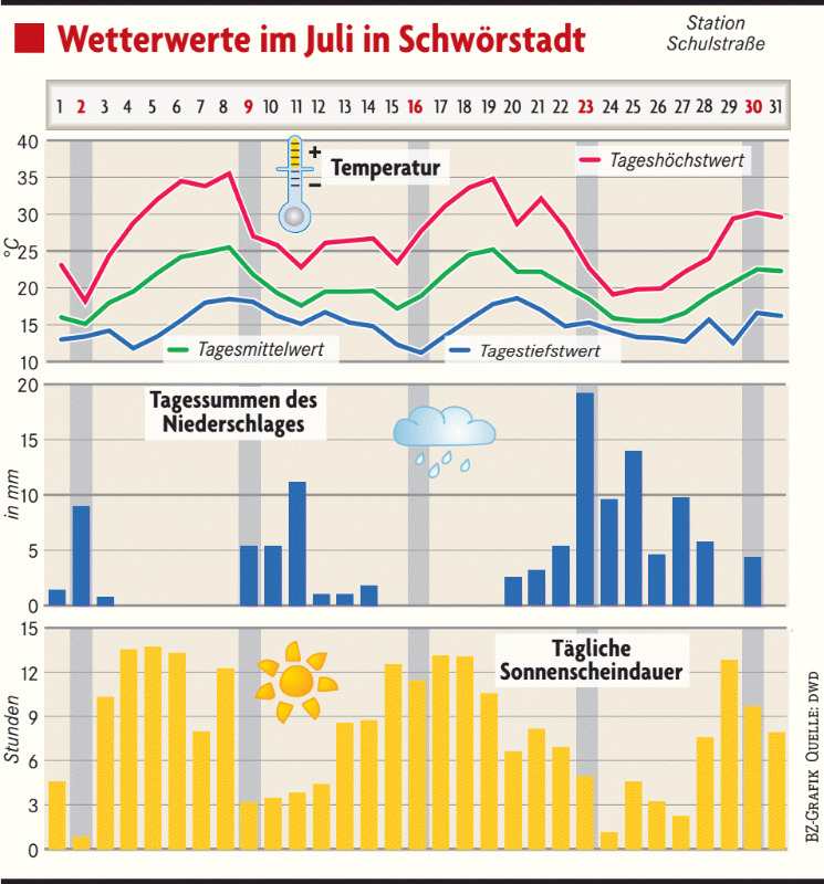 Passend zur Siebenschläferregel wechselten sich im mittleren Sommermonat warme bis heiße, sommerlich geprägte Witterungsabschnitte mit kurzen wechselhaften, gewittrigen und kühleren Perioden ab. Nach dieser abwechslungsreichen Witterung war der Juli 0,7°C zu warm, bedingt durch die zahlreichen Gewitter und Schauer in der letzten Monatsdekade 5,6 l/m² zu nass und 11 Stunden zu sonnenscheinarm.