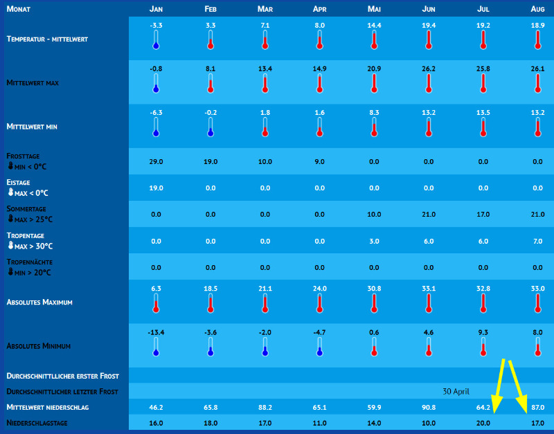 Viele Niederschlagstage im Jul und Aug, relativ wenig Hitzetage (Tropentage).