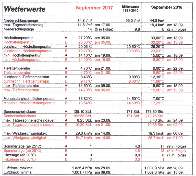 Nach 7 zu warmen Monaten in Folge war der September nach dem Januar der 2. zu kalte Monat in diesem Jahr. War der September 2016 noch von großer Hitze geprägt, blieb der 20,2 l/m² zu trockene und 7:05 Stunden zu sonnenscheinarme erste diesjährige Herbstmonat mit einer Durchschnittstemperatur von 13,82°C 0,7°C unter der Norm von 1981-2010.
