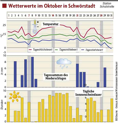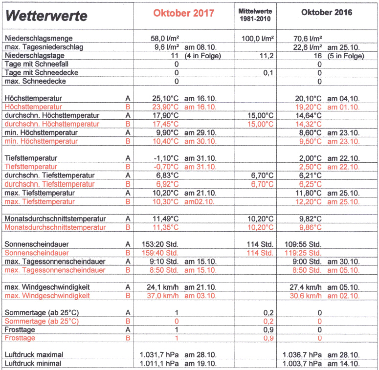 Nachdem wir dieses Jahr auf den „Altweibersommer“ verzichten mussten, bekamen wir dafür einen „Goldenen Oktober“. Gegenüber der Norm von 1981 bis 2010 war der mittlere Herbstmonat 1,3°C zu warm, 42 l/m² zu trocken und die Sonne zeigte sich 45:40 Stunden über dem langjährigen Oktobermittel.