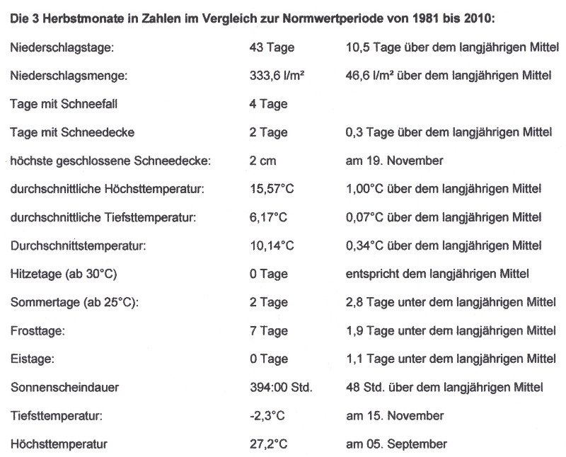 Nachdem wir dieses Jahr auf den „Altweibersommer“ verzichten mussten, bekamen wir dafür einen „Goldenen Oktober“. Gegenüber der Norm von 1981 bis 2010 war der mittlere Herbstmonat 1,3°C zu warm, 42 l/m² zu trocken und die Sonne zeigte sich 45:40 Stunden über dem langjährigen Oktobermittel.