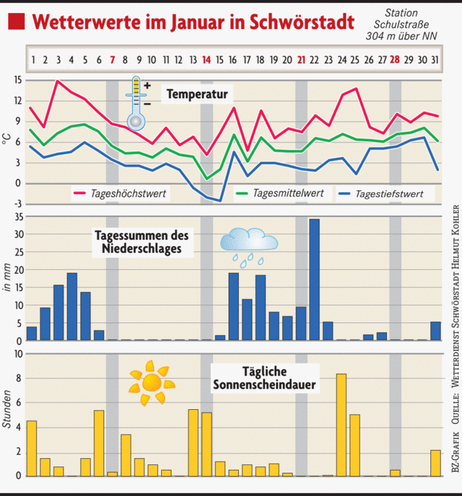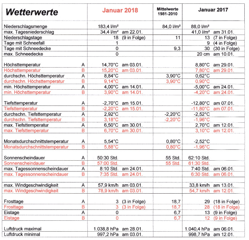 Das neue Jahr startete wie das alte aufgehört hatte, fast konnte man sagen Petrus präsentiert uns alten Wein in neuen Schläuchen, waren es doch erneut Regen, Sturm und viel zu hohe Temperaturen die uns in den ersten Tagen von 2018 begleiteten. Orkantief „Burglind“ als erster Sturm des Jahres und stärkster der letzten Jahre sorgte am 3. Januar mit umgestürzten Bäumen, abgedeckten Dächern und Stromausfällen für viel Arbeit bei den Einsatzkräften. In den ersten 5 Januartagen fiel mit 62,8 l/m² schon ¾ des normalen Januarniederschlages. Nach dem Regen der vergangenen Tage zeigte sich die Sonne ab dem Dreikönigstag 6. Januar dank der Hochs „Adam“ und „Borchert“ bei trockenem, für die Jahreszeit deutlich zu milden Temperaturen bis zum 15. Januar wieder recht häufig. In der Nacht auf den 14. gab es den ersten Frost in diesem Jahr. Seit Aufzeichnungsbeginn mussten wir nur 2007 (16.Januar) länger auf den ersten Frost des Jahres warten. In der ersten 4,4°C zu warmen Januarhalbzeit schaffte es der Winter nicht Fuß zu fassen, 32 Sonnenscheinstunden bedeuteten 58% des Januarsolls und mit 62,8 l/m² fiel schon 76% des langjährigen Januarniederschlages. Im krassen Gegensatz zu den ruhigen, niederschlags-freien vergangenen Tagen startete die zweite Januarhalbzeit mit Regen, Schnee, Graupel und Sturm sehr dynamisch, so wurde bereits am 17. mit Sturmtief „Evi“ der langjährige Januarniederschlag übertroffen. Da wir uns am 18. zum Glück am Südrand des Sturmtiefs „Friederike“ befanden, gab es im Gegensatz zur Mitte und dem Norden Deutschlands, wo beim heftigsten Sturm der letzten 10 Jahre Menschen ums Leben kamen und große Schäden entstanden in unserer Region keine Schäden. Bei weiter andauerndem sehr niederschlagsintensivem Schauerwetter fiel bis zum 23. Januar mit 175 l/m² schon über das Doppelte des normalen Januarniederschlages. Am 24. floss von Südwesten her sehr milde Luft subtropischen Ursprungs zu uns, wodurch die Temperatur am 25. auf vorfrühlingshafte 13,6°C anstieg. Die Tiefs „Helene“ und „Imke“ brachten Schwörstadt am 26. und 27. nochmals 3,4 l/m² Regen, wobei uns mit einer Südwestströmung weiterhin milde Meeresluft erreichte. Mit diesem mild-trüben „Winterfrühling“ war auch weiterhin bis zum Monatsende kein richtiger Winter nicht in Sicht.