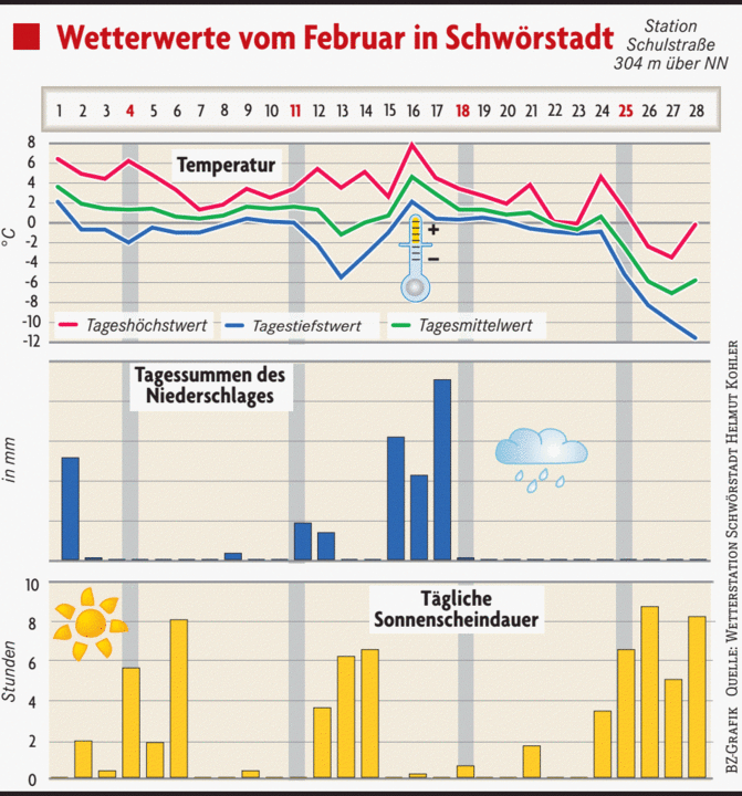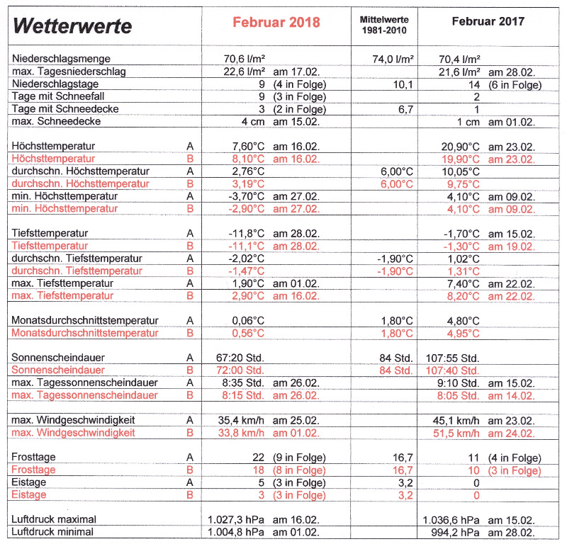 Ist's zu Lichtmess (2. Februar) mild und rein, wird's ein langer Winter sein. Nun am 2. war es weder mild noch rein, aber trotzdem war der diesjährige Februar der absolut kälteste Wintermonat. Der 1,7°C zu kalte letzte Wintermonat wurde im Gegensatz zu den ersten beiden Wintermonaten seinem Namen gerecht. Mit 70,6 l/m² Niederschlag war er nur 3,4 l/m² zu trocken und die Sonne zeigte sich an 72 Stunden 86% des Februarsolls.