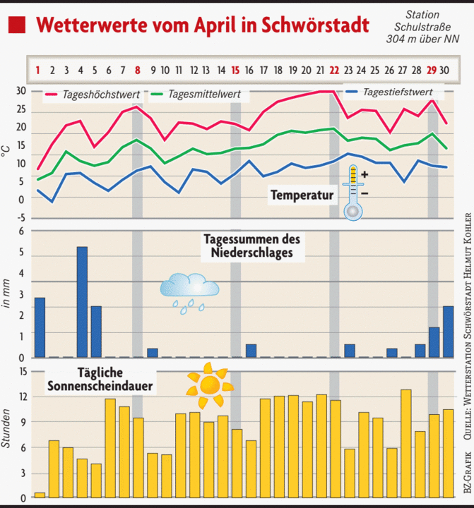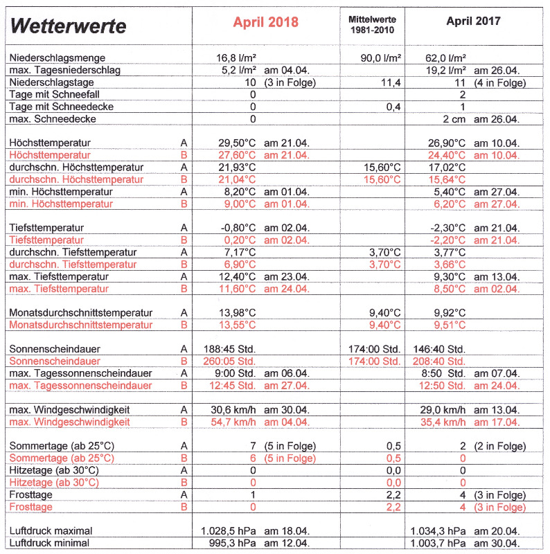 Der April macht was er will und in diesem Jahr war ihm wohl nach Sommerwetter zu Mute. Gegenüber der Norm von 1981 bis 2010 war der nach 2007 zweitwärmste, zweittrockenste und 4,6°C zu warme mittlere Frühlingsmonat 73,2 l/m² zu trocken und 86 Stunden zu sonnig. Laut Meteo Schweiz war es in unserer Region nach 2007 der zweitwärmste April seit Aufzeichnungsbeginn 1864.