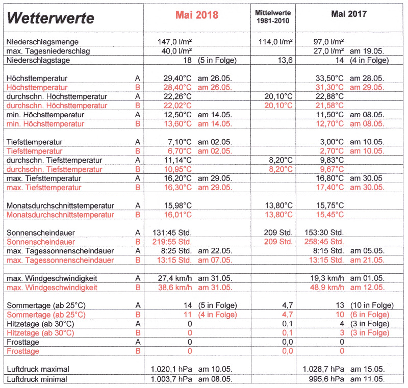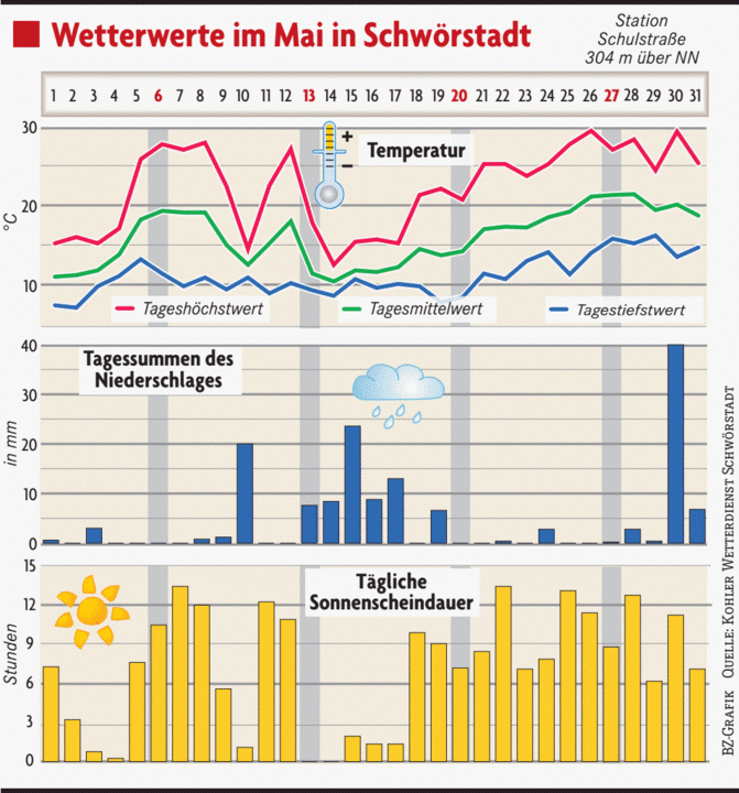Der „Wonnemonat Mai“ begann unter dem Einfluss von Tief „Quitta“ mit vielen Wolken und 0,6 l/m² Regen ca. 8°C kälter als der April aufgehört hatte, somit brauchten die Maibummler neben langen Hosen und Jacken auch einen leichten Regenschutz. Bis zum 5. blieb der Region das wolkenreiche, recht windige und kühle Wetter mit 3,6 l/m² Regen erhalten. Hoch „Quinlan“ brachte Schwörstadt am 5. Mai mit 7,5 Stunden Sonnenschein und 25,8°C das Sommerwetter zurück. Nach 4 sehr sonnigen niederschlagsfreien Sommertagen mit über 25°C in Folge, was die extreme Trockenheit noch verschärfte und 2 l/m² Regen in der Nacht zum und am 9., beendete eine Kaltfront pünktlich am Himmelfahrts-Feiertag 10. Mai zum Ärger der Vatertagsbummler die seit April andauernde trocken-sommerliche Witterung. Ob Bittprozession, Feldumgang oder Wanderung, an diesem Feiertag waren bei einer Tages-Höchsttemperatur von 14,4°C und 20 l/m² Regen (3,2 l/m² mehr als im gesamten April) warme Kleidung und Regenschutz Pflicht. Hoch „Roland“ sorgte die folgenden 2 Tage mit viel Sonne und 27,1°C am 12. für Sommerwetter. Ausgleichende Gerechtigkeit? Nachdem sich schon die Maibummler und Vatertagswanderer mit kühl-feuchten Verhältnissen abfinden mussten, wurden auch die Mütter am Muttertag wettertechnisch nicht bevorteilt, denn eine Gewitterfront und Tief „Vadjma“ brachten gegenüber dem Vortag sonnenscheinlose 15°C kühlere Temperaturen. Mit zum Teil heftigen gewittrigen Schauern ging das kühle, sonnenscheinarme Wetter so weiter. Somit fiel in der ersten noch 0,5°C zu warmen Maihälfte mit 85,2 l/m² schon 57% des langjährigen Mai-Niederschlages und die Sonne zeigte sich an 85,5 Stunden erst 41% der Mainorm. Auch zum Start in die zweite Maihalbzeit änderte sich nichts an der niederschlagsintensiven, kühlen Witterung. Nach 5 sehr trüben, ca. 2,5°C zu kalten Tagen mit 61,4 l/m² Regen stieg die Temperatur unter dem Einfluss von Hoch „Sven“ am 18., pünktlich zum Pfingstwochenende mit 9:45 Std. Sonnenschein wieder über 20°C an. Bei Temperaturen von deutlich über 20°C waren die folgenden Tage mit Unterstützung der Hochs „Tews“ und „Uwe“ nach einem sonnigen Tagesstart und Quellwolken mit einzelnen gewittrigen Schauern am Nachmittag/Abend von sogenanntem Tagesgangwetter geprägt. Durch das Zusammenspiel von Tief „Wilma“ und Hoch „Vinicius“ blieb uns mit der Zufuhr schwülwarmer und energiereicher Luftmassen die sommerlich warme Wetterlage mit einzelnen Schauern und Gewittern bis zum Monatsende erhalten. Bei einem heftigen Gewitter am 30. Mai kurz vor 21 Uhr fiel innerhalb nur 35 Minuten 40 l/m² Regen mit Hagel vermischt. An der Station B Hauptstrasse fiel zum selben Zeitpunkt innerhalb 1 Stunde 50 l/m²., während an der 8 km entfernten Station Kurgebiet Bad Säckingen nur gerade einmal 2,4 l/m² herunter kamen.