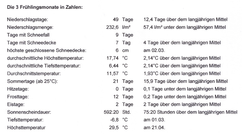 Laut Meteo Schweiz gab es in unserer Region nach 2007, 2011 und 2017 den viertwärmsten Frühling seit Aufzeichnungsbeginn 1864. Trotz eines 1°C zu kalten März war der Frühling hauptsächlich bedingt durch den rekordwarmen April gegenüber der Norm von 1981 bis 2010 1,9°C zu warm, mit 232,6 l/m² war es 57,4 l/m² zu trocken und die Sonne machte 75:20 Überstunden.