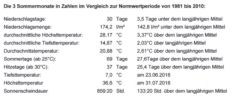 Mit 69 Sommertagen (Norm 41,4 Tage) davon 37 Hitzetage (Norm 11,6 Tage) und einem Temperaturüberschuss von 2,6°C war der Sommer 2018 nach dem Rekord-Hitzesommer 2003 der zweitwärmste seit Beginn der Wetteraufzeichnungen vor über 150 Jahren. Nach 2003 und 1983 war der Sommer 2018 mit einem Sonnenscheinüberschuss von 133:20 Std. der drittsonnigste und mit einem Niederschlagsdefizit von 142,8 l/m² der dritttrockenste seit 1966.
