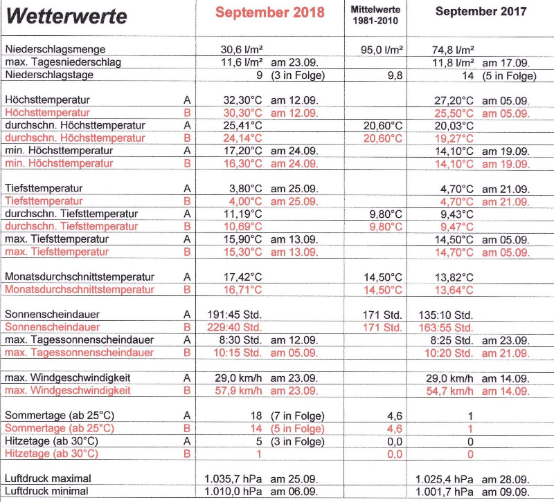 Dem Sommer war wohl nicht bewusst, dass wir schon September hatten, denn mit 18 Sommertagen (Norm 4,6 Tage), davon 5 Hitzetage (Norm 0 Tage) war der erste Herbstmonat gegenüber der Normwertperiode von 1981 bis 2010 2,9°C zu warm, 58:40 Std. zu sonnenscheinreich und 64,4 l/m² zu trocken. In unserer Region ist es nach 1947 und 2016 der drittwärmste September seit Aufzeichnungsbeginn vor über 150 Jahren.