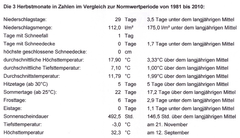 hier der Rückblick auf den trockensten, zweitsonnigsten und drittwärmsten meteorologischen Herbst seit Aufzeichnungsbeginn 1966: