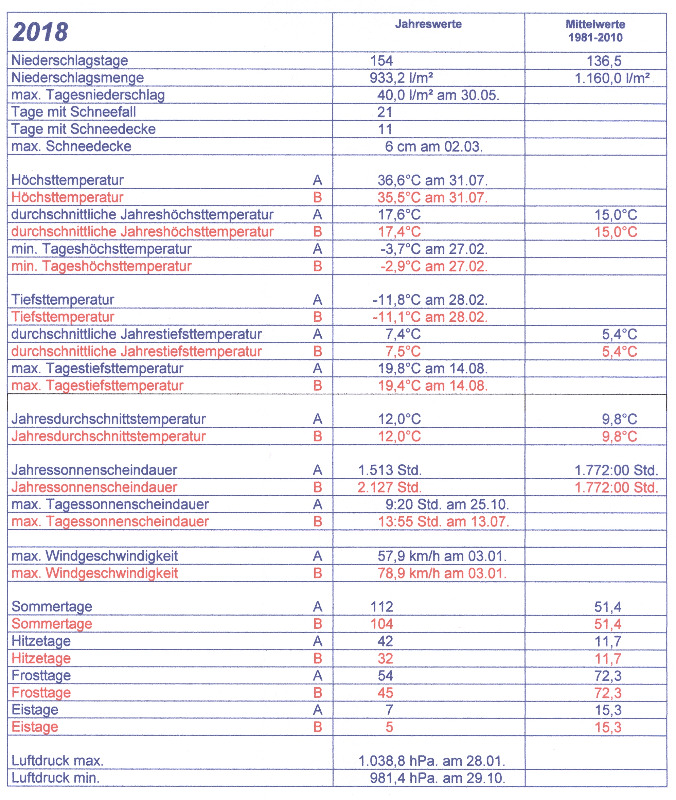 Das Jahr 2018 geht gegenüber der Norm von 1981 bis 2010 mit einer positiven Temperaturabweichung von 2,2°C als wärmstes Jahr seit Messbeginn vor über 150 Jahren in die Geschichtsbücher ein. Besonders besorgniserregend ist die Tatsache, dass der Jahres-Temperaturrekord in den letzten 5 Jahren nach 2014 und 2015 in dem zurückliegenden Jahr zum 3. mal übertroffen wurde. Mit 933,2 l/m² fiel nur 80% des Jahres-Niederschlages, aber Dank den zu nassen Monaten Januar, Mai und Dezember wurde aus dem Rekord-Dürresommer kein Rekord-Dürrejahr. Passend zum rekordwarmen Jahr schien die Sonne 355 Stunden länger als im langjährigen Jahressoll.