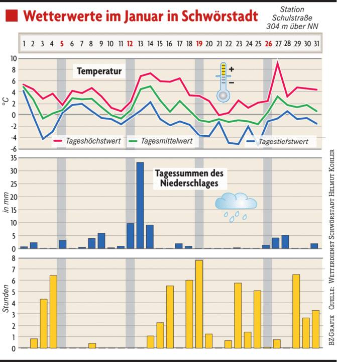 Der gegenüber der Norm von 1981 bis 2010 9 Stunden zu sonnige und nur 0,6 l/m² zu trockene Januar war mit einem leichten Temperaturüberschuss von 0,3°C bereits der 10. zu warme Monat in Folge.