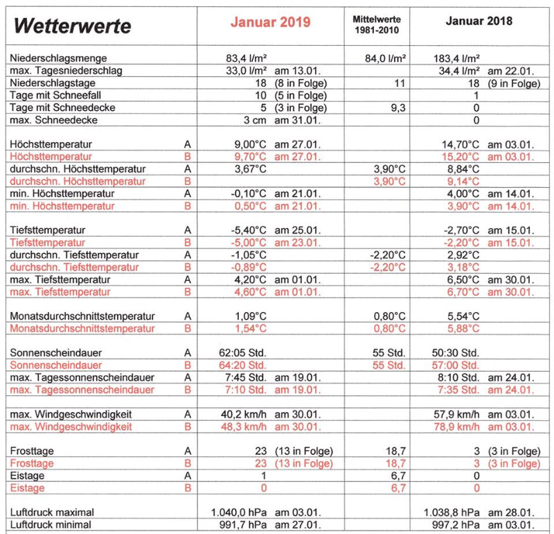 Unter dem wechselnden Einfluss von Tief „Zeetje“ und Hoch „Angela“ startete das Jahr bei für die Jahreszeit ca. 1°C zu hohen Temperaturen mit einem Wechsel von Sonne, Wolken und Regen. Am 5. Januar brachte der erste Schneefall des Jahres eine ca. 1 cm hohe Schneedecke, die jedoch bei Plustemperaturen bis zum Abend wieder taute. In der Folge verabschiedete sich Hoch „Angela“ und die Tiefs „Andre“, „Benjamin“ und Christoph“ sorgten mit einer schwankenden Schneefallgrenze für trübes Schauerwetter. Am 12. war Tief „Donald“ mit 2 cm Neuschnee für die bisher höchste Schneedecke in diesem Herbst / Winter verantwortlich, die jedoch mit der Zufuhr wärmerer Luftmassen auch wieder bis zum Abend taute. Bei dem nachfolgenden Regen durch Tief „Florenz“ fiel vom Abend des 12. Januars bis zum Morgen des 14. Januars innerhalb 36 Stunden mit 51 l/m² 61% des langjährigen gesamten Januar-Niederschlages. In der ersten 1°C zu warmen und niederschlagsreichen Januarhalbzeit fiel somit mit 68,6 l/m² schon 82% des Januarsolls und die Sonne schien an 15,5 Std. erst 28% des normalen Januar-Sonnenscheins. Unter Zwischenhocheinfluss begann die zweite Januarhälfte recht sonnig. Nachdem Tief „Hinne“ mit Regen- und Schneeschauern nochmals für 1,8 l/m² Niederschlag sorgte, war ab dem 18. Januar das Hoch „Brigida“ mit maritimer Polarluft wetterbestimmend. Während die erste Winterhälfte noch deutlich zu warm ausgefallen war, erwartete uns jetzt mit einem Sonne- Wolkenmix mit einzelnen Schneeflocken ruhiges, aber recht kaltes Winterwetter. Am Morgen des 21. Januar verhinderte Hochnebel jedoch die Sicht auf den Blutmond und mit einer Tages-Höchsttemperatur von –0,1°C verzeichneten wir den ersten Eistag (Dauerfrost) in diesem Winter. Mit –5,4°C erreichten wir am 25. die kälteste Temperatur in diesem Januar. Das Tief „Laszlo" beendete am 26. den ruhigen und kalten Witterungsabschnitt. Durch die von Westen einströmende milde Meeresluft gingen die Schneeschauer in Regen über und am 27. registrierten wir mit 9,0°C die höchste Temperatur des Monats. Mit dem auf „Laszlo“ folgendem Tief „Martin“ kam die Luft ab dem 28. Januar zunehmend aus Nord, wodurch bei langsam sinkenden Temperaturen die Schauer wieder in Form von Schnee fielen. Unter dem weiteren Einfluss von Tief „Oskar“ blieb uns dieses wechselhaft nasskalte Winterwetter mit einer schwankenden Schneefallgrenze bis zum Monatsende erhalten, wobei wir am letzten Januartag mit 3 cm die höchste Schneehöhe des Monats maßen.
