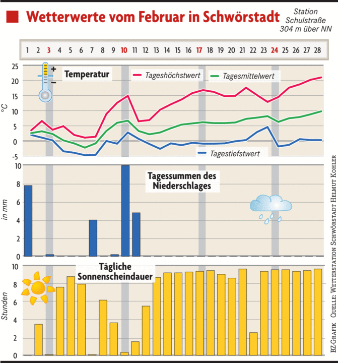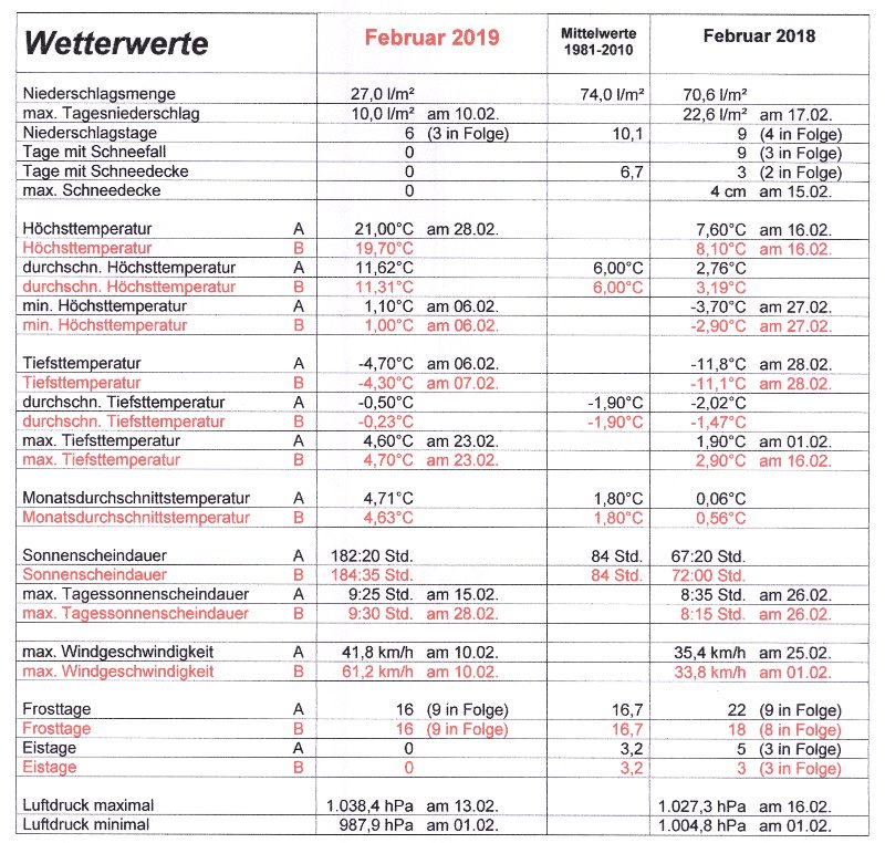 Noch nie seit Aufzeichnungsbeginn 1966 war ein Februar so sonnig und nur 1975 mit 7,3 l/m² und 1982 mit 16,8 l/m² gab es in einem Februar noch weniger Niederschlag. In dem 2,9°C zu warmen letzten Wintermonat fiel mit 27 l/m² nur 37% des normalen Februar-Niederschlages und mit 184,5 Sonnenstunden schien die Sonne über das doppelte (220%) des Februarsolls.