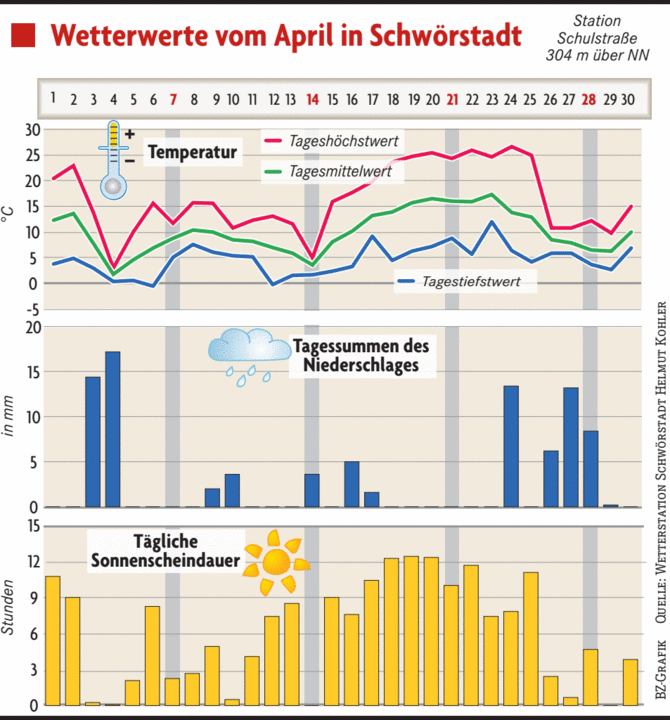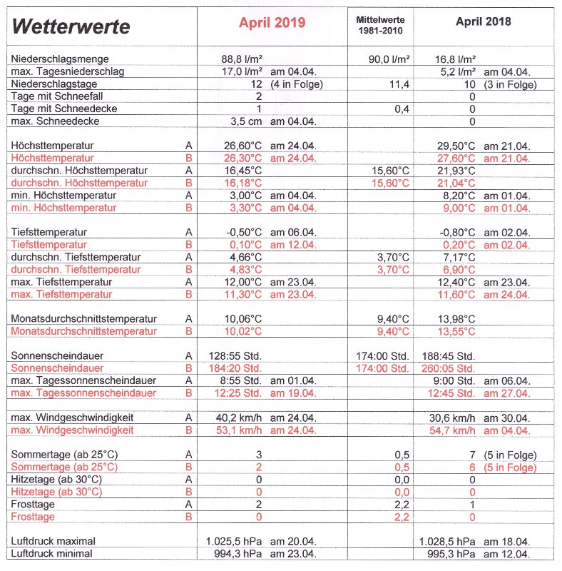 „April-April, der macht was er will“ und dieses Jahr brachte er neben einer Rekord-Schneehöhe auch sommerliche Wärme. Der 10,5 Stunden zu sonnige April 2019 war gegenüber der langjährigen Norm mit einer positiven Temperaturabweichung von 0,7°C der 13. zu warme Monat in Folge. Somit gab es einen sehr bedenklichen neuen Rekord. Laut Deutschem Wetterdienst gab es bundesweit seit Beginn der Wetteraufzeichnungen 1881 noch nie 13 zu warme Monate in Folge. Mit dem Begriff „schönes Wetter“ verbinden wir im klassischen Sinn Wärme und Sonnenschein, aber Angesichts des aktuellen Niederschlagsdefizits, die ersten 3 Monate des Jahres waren alle zu trocken, muss der Niederschlagsüberschuss von 9,6 l/m² an der Station Hauptstrasse zum Wohle der Vegetation als sehr erfreulich aufgefasst werden.