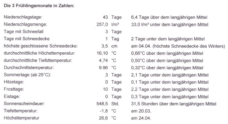 „April-April, der macht was er will“ und dieses Jahr brachte er neben einer Rekord-Schneehöhe auch sommerliche Wärme. Der 10,5 Stunden zu sonnige April war gegenüber der langjährigen Norm mit einer positiven Temperaturabweichung von 0,7°C der 13. zu warme Monat in Folge. Laut Deutschem Wetterdienst gab es bundesweit seit Beginn der Wetteraufzeichnungen 1881 noch nie 13 zu warme Monate in Folge. Zum Wohle der Vegetation gab es an der Station B einen Niederschlagsüberschuss von 9,6 l/m².