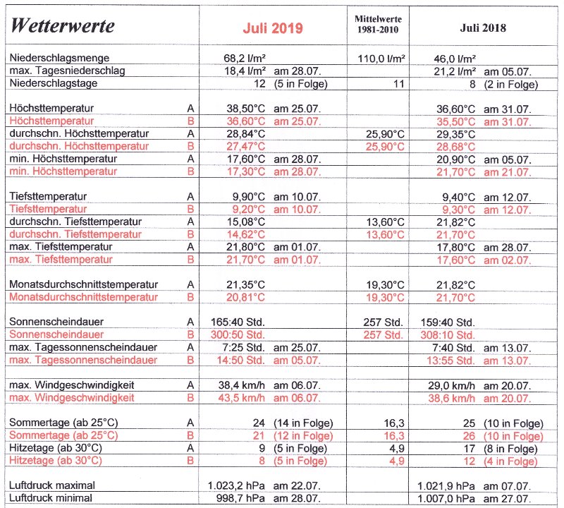 Der Juli begann unter der Nachwirkung von Hoch „Vera“ wie der Juni aufgehört hatte schwül-heiß, trocken, sehr sonnig und als schweißfördernden Zusatz gab es in der Nacht zum 1. Juli mit einer Tiefsttemperatur von 21,8°C die wärmste Tropennacht (die minimale Nachttemperatur sinkt nicht unter 20°C) seit Aufzeichnungsbeginn 1997. Nach der zurückliegenden Hitzewelle mit stark gesundheitsgefährdeten Taupunkten von bis zu 25°C sorgte Hoch „Winnie“ ab dem 3. mit nördlichen trockenen Luftmassen für trockene Wärme um 30°C am Tag und angenehmen schlaffördernden Temperaturen um 15-16°C in der Nacht. Nach 13 niederschlagsfreien Tagen in Folge brachten gewittrige Schauer am 6. und 7. 9,6 l/m² Regen. Nördliche Luftmassen leiteten dann ab dem 8. Juli einen kühleren aber sehr sonnigen und niederschlagsfreien Witterungsabschnitt ein. Am 11. nahm die Bewölkung unter dem Einfluss von Tief „Quinctilius“ zu und bis zum 15. fiel bei unterschiedlich starken Schauern 16 l/m² Regen. Nach dieser kühleren Wetterphase war die erste Julihalbzeit immer noch 0,7°C zu warm, mit 25,6 l/m² fiel nur 23% des normalen Juliniederschlages und die Sonne schien an 144 Stunden schon 56% des Julisolls. Zum Start der zweiten Julihälfte kehrte mit Hoch „Xandra“ das sehr sonnige, von Tag zu Tag wärmere und niederschlagsfreie Hochsommerwetter zurück. Tief „Sepp“ bescherte uns am 21. mit gewittrigen Schauern 7,4 l/m² des sehr dringend benötigten Regens, bevor am 22. eine Omega-Wetterlage mit Hoch „Yvonne“ eine extreme Hitzewelle einleitete. Am 25. verzeichneten wir mit 38,5°C nach 2003 und 2015 die dritthöchste Temperatur seit Aufzeichnungsbeginn und in der Nacht auf den 26. Juli hatten wir mit einer Tiefsttemperatur von 21,2°C die zweite Tropennacht des Monats. Nachdem sich das Hitzehoch „Yvonne“ Richtung Norden verabschiedete erfüllte uns Tief „Vincent“ den sehnlichen Wunsch nach Regen. Vom späten Abend des 26. Juli bis zum 27. Juli wurde mit 32 l/m² das extreme Niederschlagsdefizit etwas abgeschwächt. Mit den eingeflossenen nördlichen Luftmassen hatten wir am 28. mit Nachmittagstemperaturen um 17°C ca. 20°C kühlere Temperaturen als noch 2 Tage zuvor. Die letzten 3 Julitage zeigten sich bis auf einen kurzen Schauer am Abend des 30. mit 2 l/m² Regen bei einem Sonne-Wolkenmix angenehm warm und trocken.