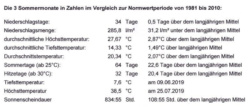 Mit extremen Hitzewellen und dem nach 2003 zweitwärmsten Juni erlebten wir den drittwärmsten Sommer seit Aufzeichnungsbeginn 1864. Der meteorologische Sommer 2019 brachte uns einen Temperaturüberschuss von 2,1°C, die Sonne machte 109 Überstunden und trotz eines zu niederschlagreichen August fiel 31,2 l/m zu wenig Niederschlag.