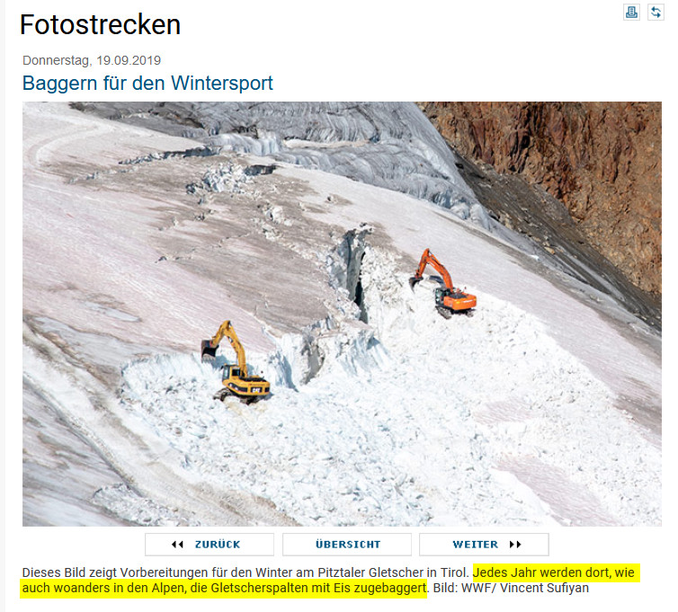 Was auch so eine heilige Kuh ist, ist der Sport. Da heiligt der Zweck (einige wenige immens reich zu machen) jegliches Mittel. Das sieht man hier bei den Baggern auf der Gletscherspalte, das sieht man beim Bau riesiger Stadien und Sportanlagen, An- und Abreise von zigtausenden Zuschauern, Sportlern, Reportern etc. bei jedem Spiel oder Wettkampf, Fanartikel, Bau un Betreiben von Skiliften, Rennbahnen etc. Wenn so was geplant wird, brüllen alle begeistert Hurra. Kein Gedanke an die Umwelt. Wer das als Argument vorbrächte, würde auf der Stelle gesteinigt.