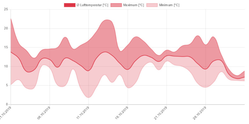 Der Oktober begann mit viel Sonnenschein 24,1°C warm, bevor am Abend des 1. Oktobertages ein Gewitter das Altweibersommerwetter beendete. Mit Ausnahme des Zwischenhochs „Käthe“ am 3., dem Tag der Deutschen Einheit, gestaltete sich das Wetter unter dem Einfluss der durchziehenden Tiefdruckgebiete „Nils“, „Olaf“, „Peter“ und „Quentino“ bis zum 11. Oktober mit vielen Wolken, Regen und Wind sehr herbstlich. Mit Hoch „Lisbeth“ erlebten wir 4 Tage lang eine Renaissance des Altweibersommers. Mit 25,3°C bekamen wir am 13. Oktober den 78. Sommertag (ab 25°C) des Jahres und zugleich die höchste Temperatur des Monats. Nach dieser goldenen Oktober- Wetterphase sorgte Tief „Sebastien“ am 15. mit einer Kaltfront für feucht-trübes Herbstwetter. Somit war die erste Oktoberhalbzeit 2,2°C zu warm, mit 70,8 l/m² fiel schon 71% des normalen Oktoberniederschlages und die Sonne schien an 52,5 Stunden 46% des Oktobersolls. Dank einem Zwischenhoch startete die zweite Oktober-hälfte am 16. noch mit 8,5 Sonnenscheinstunden bevor die Tiefs „Thilo“ und „Urban“ in der Folge mit sehr feuchten und milden Luftmassen aus dem westlichen Mittelmeerraum für den in der Vergangenheit sehr selten gewordenen länger anhaltenden Regen sorgten. Bereits am 19. wurde der langjährige durchschnittliche Oktoberniederschlag von 100 l/m² deutlich überschritten. Die Hochs „Majla“ und „Nicola“ bescherten uns ab dem 23. einerseits einen "Goldenen Oktober" dem gegenüber stand jedoch trübes Novemberwetter, da die eingeflossene feuchte Luft bei nächtlichem Aufklaren zur morgendlichen Nebelbildung neigte, aber was wäre ein Herbst ohne Nebel. Nachdem wir bei viel Sonnenschein mit 21,8°C am 27. nochmals einen „warmen Tag“ (ab 20°C) genießen konnten, sorgte die Kaltfront von Tief „Yaroslav“ neben Regen auch für einen deutlichen Temperaturrückgang. Die letzten Oktober-tage mussten wir uns bei Dauergrau und 21,2 l/m² Regen mit für die Jahreszeit normalen Höchstwerten von rund 9 bis 10 Grad begnügen.