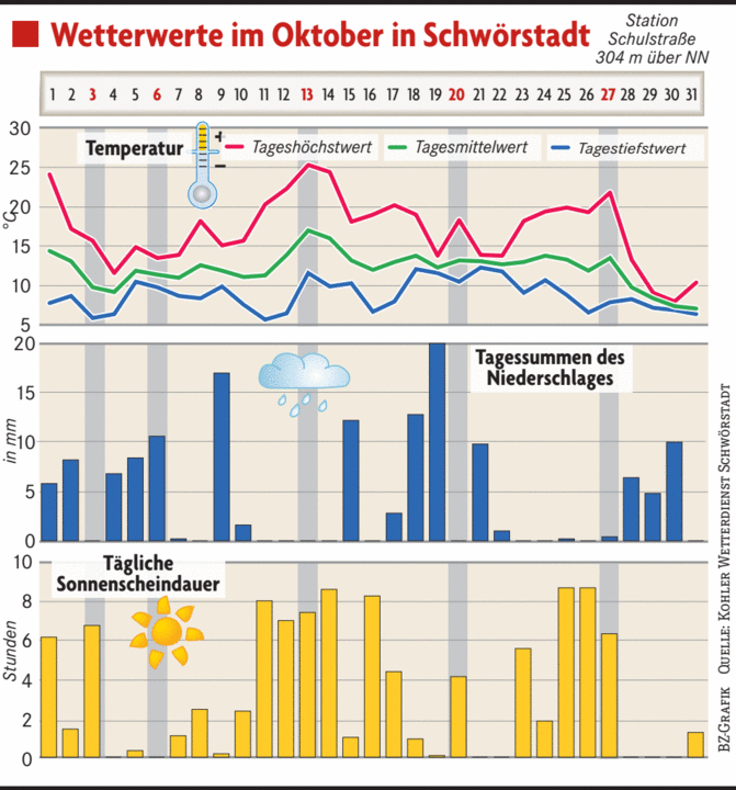 Gegenüber der Norm von 1981 bis 2010 war der mittlere Herbstmonat laut Meteo Schweiz der fünftwärmste Oktober seit Aufzeichnungsbeginn 1864. In Schwörstadt war es mit einer positiven Temperaturabweichung von 2°C bereits der neunte deutlich zu warme Monat, nach 8 zu trockenen Monaten neben dem August mit einem Niederschlagsüberschuss von 39 l/m² der zweite zu nasse Monat und mit einem Sonnenscheindefizit von 9,5 Stunden der erste zu trübe Monat des Jahres.