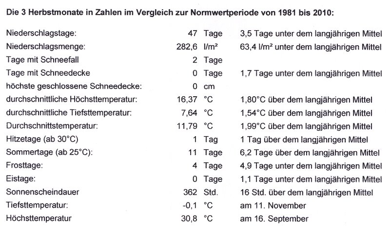 Der letzte 1,2°C zu warme Herbstmonat war der 10. zu warme, mit 4,6 l/m² der 9. zu trockene und mit einem Sonnenscheindefizit von 1,5 Stunden der 3. zu trübe Monat in diesem Jahr.