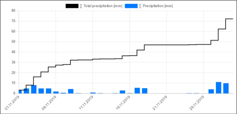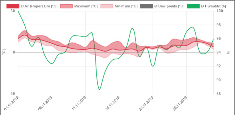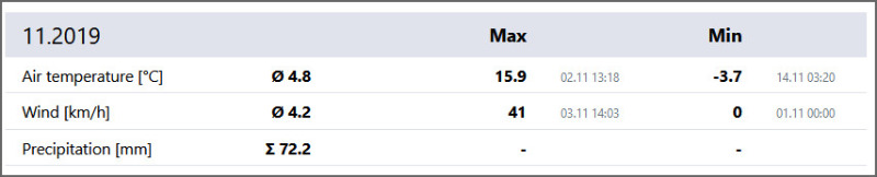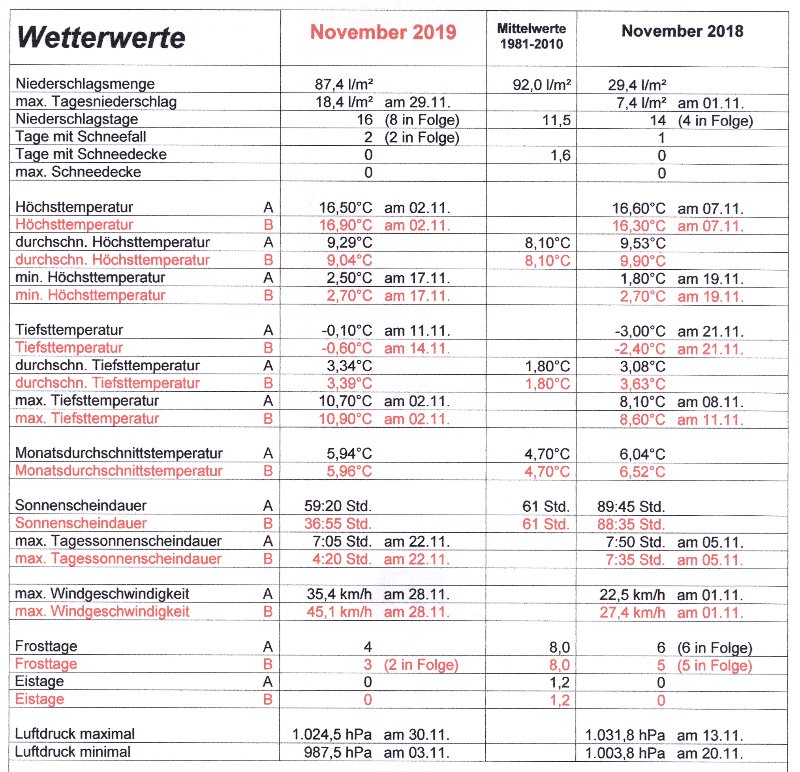 Mit dem Tiefdruck-Trio „Zed“, „Benedikt“ und „Arne“ startete der letzte Herbstmonat grau, regenreich und rund 5°C zu warm. Die ersten 4 Novembertage regnete es mit 35,2 l/m² Regen schon 6 l/m² mehr als im gesamten November 2018. Bei weiterhin unbeständigem Wetter gingen die Temperaturen unter dem Einfluss von Tief „Carletto“ ab dem 7. auf einstellige Höchstwerte zurück. Nach 8 Niederschlagstagen in Folge war der 9. der erste niederschlagsfreie Tag des Monats. Verpassten wir am 10. November mit 0,1°C den ersten Frosttag in diesem Herbst noch knapp, war es dann Dank Hoch „Paloma“ mit einer sternenklaren Nacht am frühen Morgen des St. Martinstags dem 11.11. mit minus 0,1°C soweit. Tiefdruckbestimmt mit nur 8,5 Stunden Sonnenschein und 2,4 l/m² Regen ging die erste Monatshälfte zu Ende. Somit fiel in der ersten 1,6°C zu warmen Novemberhalbzeit mit 49,4 l/m² 54% des normalen Monatsniederschlages und mit 23,5 Std. zeigte sich die Sonne erst 38% des Novembersolls. Die zweite November-halbzeit begann mit einem Zwischenhoch recht sonnig und 10,3°C warm, bevor am 17. Tief „Günther“ für den ersten Schneefall in diesem Herbst sorgte. Bis zum 18. fiel bei dauergrau 14 l/m² Niederschlag in Form von Schnee und Schneeregen. Zwischen den Tiefs „Ingmar“, „Jörg“, „Luis“ über West- und Südeuropa und dem über Westrussland liegenden Hoch „Quinci“ bestimmte die folgenden Tage ruhiges Novemberwetter mit Nebel-Hochnebel, sonnigen Abschnitten und der Jahreszeit entsprechenden Temperaturen unser Wettergeschehen. Ab dem 24. stiegen die Tagestemperaturen mit einer süd-westlichen Strömung wieder in den zweistelligen Bereich an, wodurch wir am 27. mit 15,1°C die zweithöchste Temperatur des Monats verzeichneten. Nach 8 niederschlagsfreien Tagen in Folge sorgte der ehemalige Tropensturm „Sebastien" ab dem 27. mit lebhaftem Westwind für Regen. Die folgenden 2 Tage blieb es bei dem regnerischen Westwindwetter, wobei wir am 29. November mit 18,4 l/m² den höchsten Tagesniederschlag des Monats hatten. Tief „Romy“ sorgte dann am letzten Novembertag mit sinkenden Temperaturen und viel Sonnenschein für eine Wetterberuhigung.
