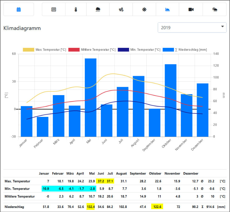 MeteoMap.cloud haben wir nun so angepasst, dass auch die einzelnen Jahre des Klimadiagramms angeschaut werden können. Mein 2019 für Bolken schaut so aus: