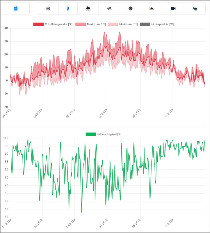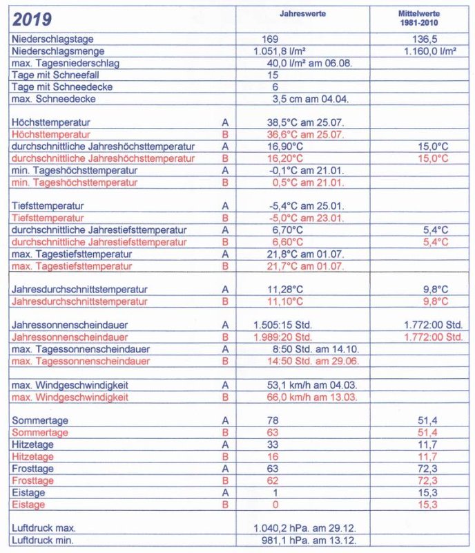 Hier der Jahresrückblick 2019 der Wetterstation Schwörstadt: A: Station Schulstrasse B: Station Ossenberg