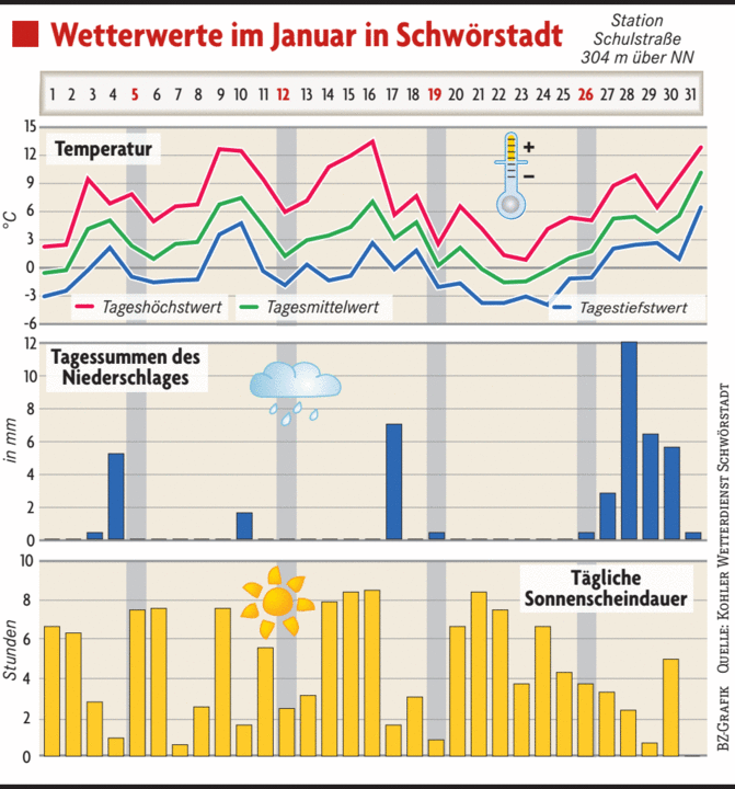 Mit Hoch „Xia“ startete das neue Jahr hochdruckbestimmt und Dank dem „Möhlin-Jet“ bei uns auch sehr sonnig. Tief „Fabio“ brachte uns in der Nacht auf den 4. und am 4. Januar 5,6 l/m² Regen bevor Hoch „Alma“ ab dem 5. wieder für trockenes, viel zu warmes und sehr sonniges Wetter sorgte. In den ersten 6 Januartagen hatten wir mit 31,5 Sonnen-scheinstunden bereits 57% des gesamten Januarsolls erreicht. Bedingt durch warme südwestliche Luftmassen und 7,5 Stunden Sonnenschein stieg die Temperatur am 9. auf frühlingshafte 12,4°C an. Das einzige, das in diesem „Mildwinter“ an einen Winter erinnerte waren die leichten Nachtfröste in den zum Teil sternenklaren Nächten. Nur unterbrochen von 1,6 l/m² Regen durch die Tiefs „Clara“ und „Damira“ am 10. blieb es mit Hoch „Christian“ bis zur Monatsmitte bei dem Wechsel von sternenklaren Nächten, Nebel, Hochnebel und Sonnenschein, wobei wir am 13. schon die langjährige Januar-Sonnenscheindauer erreichten. Wenig überraschend war die erste Januarhälfte 2,2°C zu warm, mit 7,2 l/m² fiel erst 8,6% des normalen gesamten Januar-Niederschlages und die Sonne schien an 71 Std. schon 129% des Januarsolls. Auch die Natur reagierte auf das frühlingshafte Wetter, es befanden sich bereits Hasel- und Erlenpollen in der Luft. Auch die zweite Januarhalbzeit begann mit Hoch „Dirk“ sehr sonnig und mild. Bevor Tief „Heike“ am 17. Januar den mit ihrer mitgeführten Kaltfront und 7 l/m² Regen den „Frühlingswinter beendete, gab es am 16. mit 13,2°C die höchste Temperatur des Monats. Ab dem 19. übernahm das gewaltige Hoch „Ekart“ das Zepter und sorgte die folgenden 8 Tage neben viel Sonnenschein mit Hochnebelfelder und Nachtfrösten für ruhiges Hochdruckwetter. Am 20. Januar verzeichneten wir mit 1.045,8 hPa. den höchsten Luftdruck seit Messbeginn und nach nur 2/3 des Monats erreichten wir am 22. mit 107 Std. die höchste Januar-Sonnenscheindauer seit Beginn der Messreihe 1966. Mit der Verdrängung von Hoch „Ekart“ durch Tief „Kim“ endete am 27. Januar die schon seit Wochen andauernde ruhige Hochdruckwetterlage. Das Sturmtief „Lolita“ bescherte uns am 28. begleitet von heftigen Graupel-schauern mit Böen um 70 km/h den ersten Sturm des Jahres. Ohne Nachtfröste und bei wieder über die Norm ansteigenden Temperaturen blieb uns das wechselhafte Wetter bis zum Monatsende erhalten.