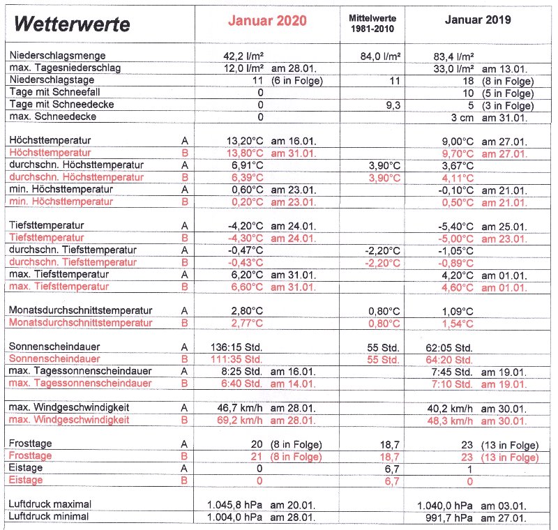 Andauernde Hochdrucklagen sorgten für einen 2°C zu warmen Januar. Bedingt durch die Frosttemperaturen in den oft sternenklaren Nächten gab es jedoch keine neuen Temperaturrekorde. Mit einem Sonnenscheinüberschuss von 81 Stunden erreichten wir einen neuen Januar-Sonnenscheinrekord. 42,2 l/m² reichten nur die Hälfte des langjährigen Januar-Niederschlages und 1.045,8 hPa. sorgten für einen neuen Luftdruckrekord seit Beginn der Messreihe 1966.