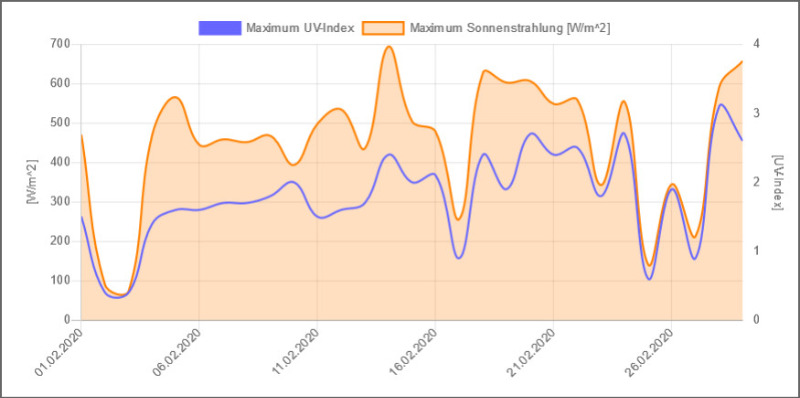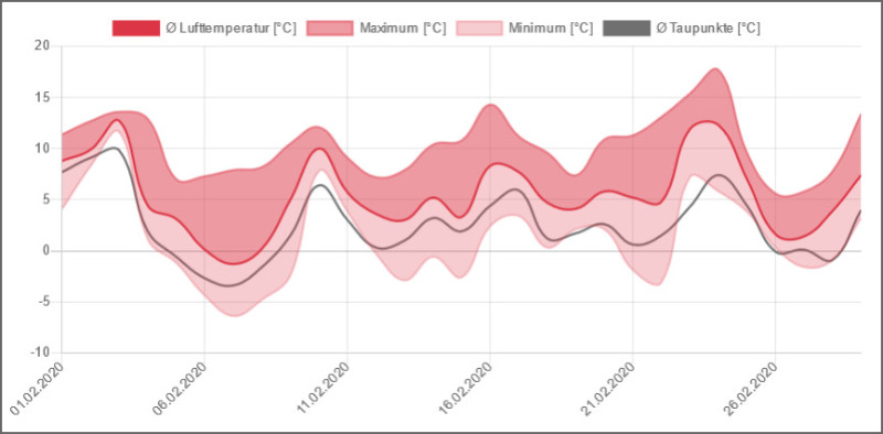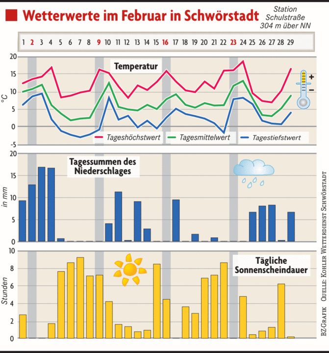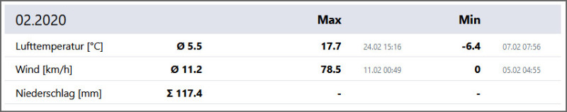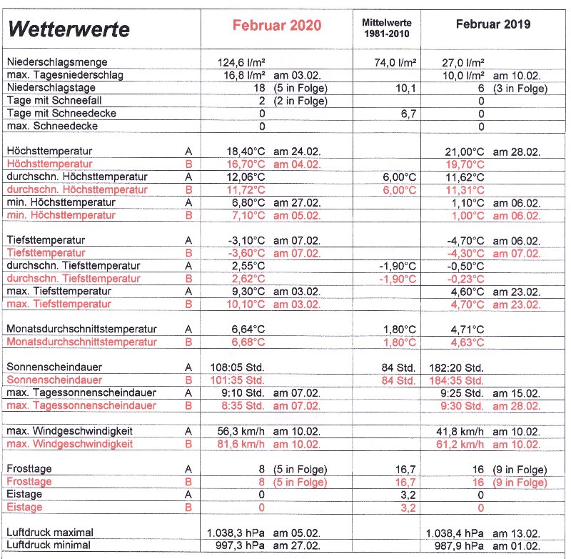Der letzte meteorologische Wintermonat begann unter dem Einfluss von Tief „Ottilia“ mit einer strammen südwestlichen bis westlichen Strömung frühlingshaft warm, sehr nass und sehr windig. In der Nacht auf den 4. Februar brachte uns das Sturmtief „Petra“ Böenspitzen bis 80 km/h. Auf dem Höhepunkt des Sturmes stieg die Temperatur mit 16,7°C auf die höchste Februar-Nachttemperatur seit Messbeginn an. Ausgehend von Sturmtief „Petra“ erreichte uns in der 2. Nachthälfte eine markante Kaltfront, so dass die Temperatur bis zum Morgen mit einem massiven Temperatursturz innerhalb von nur 6 Stunden von 16,7°C auf 3,2°C sank. Innerhalb der ersten 4 Februartage fiel mit 56 l/m² schon 76% des Februarsolls und 14 l/m² mehr als im gesamten Januar 2020. Hoch „Frank“ übernahm ab dem 5. das Zepter und sorgte bis zum 9. mit kälterer Meeresluft polaren Ursprungs für ruhiges, sehr sonniges Wetter mit Nachtfrösten. In der Nacht auf den 10. Februar erreichte uns Sturmtief „Sabine“, das uns 2 Tage lang mit Böen von über 80 km/h beschäftigte. Neben einigen Feuerwehreinsätzen durch umgestürzte Bäume sorgte „Sabine“ auch für geschlossene Schulen und Kindergärten. Auch nachdem sich „Sabine“ verabschiedete, blieb uns durch die Tiefs „Tomris“ und „Uta“ das windige bis stürmische Wetter mit Regen- und Graupelschauern bis zur Monatsmitte erhalten, wobei bereits am 13. der langjährige durchschnittliche Februar-Niederschlag übertroffen wurde. In der ersten 4,4°C zu warmen Februarhalbzeit fiel mit 83,2 l/m² schon 112% des normalen Februarniederschlages und die Sonne schien an 61 Std. schon 73% des Februarsolls. Auch nach der ersten Februarhälfte blieb uns mit den Tiefs „Viktoria“ und „Wiltraud“ das unbeständige teils windige Wetter mit frühlingshaft milden Temperaturen erhalten. Wenn man den Sinn der Fasnacht darin sieht den Winter zu vertreiben war sie dieses Jahr absolut nicht erforderlich, denn wo kein Winter war konnte auch keiner vertrieben werden. Mit 18,4°C hatten wir am Rosenmontag bei strahlendem Sonnenschein sehr warmes „Biergartenwetter“. Am Aschermittwoch 26. Februar stellte sich erneut eine für den diesjährigen Februar typische Westwetterlage ein. Die Sturmtiefs „Zehra“, „Bianca“ und „Charlotte“ sorgten bis zum Monatsende mit stürmischen Böen für wechselhaftes Schauerwetter.
