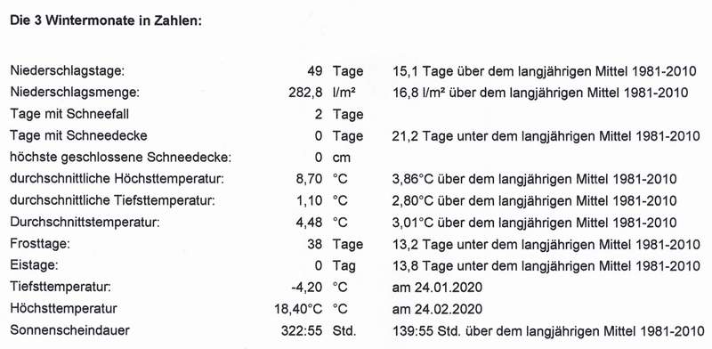 Die Bezeichnung Winter ist für den meteorologische Winter 2019/2020 ein Hohn, denn er fand in Schwörstadt nur auf dem Kalender statt. Mit einer positiven Temperaturabweichung von 3°C war es nach dem meteorologischen Winter 2006/2007 der zweitwärmste Winter seit Beginn der systematischen Wetteraufzeichnungen 1864. Für die „Nicht-Winterwärme“ waren neben anhaltenden Hochdruckgebieten im Januar besonders die sehr häufigen Westwindlagen mit milder Atlantikluft verantwortlich. Seit Messbeginn 1966 gab es am Hochrhein nur in den meteorologischen Wintern 2007/2008, 2013/2014 und 2019/2020 keine Schneedecke. Bei nur 2 Tagen mit Schneefall gab es mit 282,8 l/m² einen Niederschlagsüberschuss von 16,8 l/m² und die Sonne schien gegenüber der langjährigen Winternorm 140 Stunden länger.