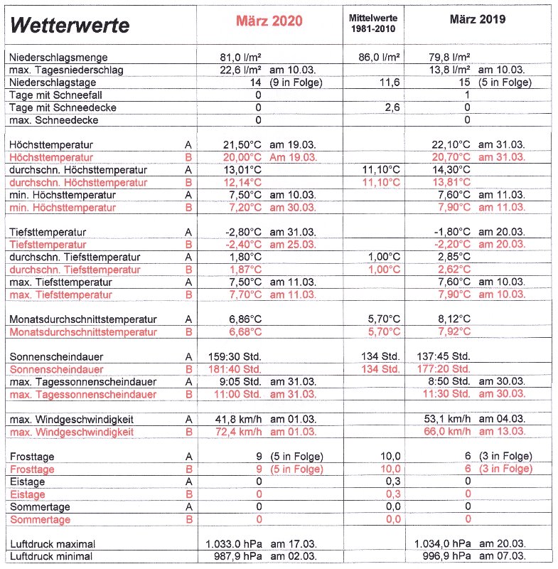 Obwohl wir in den ersten 10 Tagen mit 75,4 l/m² bereits 88% des normalen gesamten März-Niederschlages erreicht hatten, war der 1,2°C zu warme und 48 Stunden zu sonnige erste Frühlingsmonat bedingt durch die sehr trockenen letzten beiden Monatsdekaden noch 5 l/m² zu trocken.