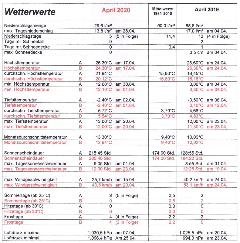 Mit strahlendem Sonnenschein und Nachtfrösten durch das mächtige Hoch „Keywan“ startete der April wie der März aufgehört hatte. Mit reichlich Sonnenschein floss aus Norden aber auch kalte Luft polaren Ursprungs in unsere Region. Am 5. April verlagerte sich das seit über 1 Woche herrschende Hoch „Keywan“ von Westeuropa Richtung Mitteleuropa. Mit den ablösenden Hochs „Loris“ und „Max“ floss aus Süden sehr milde Luft ein, die für frostfreie Nächte und Tages-Höchsttemperaturen auf Mainiveau von 23 bis deutlich über 24°C sorgte. Mit 25,3°C verzeichneten wir am Karsamstag 11. April den ersten Sommertag in diesem Jahr. Nach der außergewöhnlich sonnigen und warmen Karwoche ging es auch am Osterwochenende trotz ein paar Wolken mit viel Sonnenschein und warmen Temperaturen weiter. Mit einem Schwall Polarluft fiel die Tages-Höchsttemperatur am 14. mit 15,6°C trotz Sonnenschein von früh bis spät für einen Tag deutlich verhaltener aus. In der absolut niederschlagsfreien, 2,1°C zu warmen ersten Aprilhälfte schien die Sonne an 161 Stunden schon 93% des normalen gesamten Aprilsolls. Unter dem Einfluss der Hochs „Nikolas“ und „Odilo“ ging es auch in der zweiten Aprilhalbzeit staubtrocken, sehr sonnig mit nur einzelnen Quell- und Schleierwolken und Temperaturen, die eigentlich dem ersten Sommermonat Juni entsprechen weiter. Am 17., 18. und 19. April gab es 3 weitere Sommertage, wobei schon am 17. die normale April-Sonnenscheindauer übertroffen wurde. Die hohe Konzentration an Pollen und Saharastaub begünstigten als Kondensationskeime am 20. die Wolkenbildung, so dass die Sonne den ganzen Tag über nur 15 Minuten zum Vorschein kam. Bereits einen Tag später sorgte Hoch „Odilo“ wieder für zunehmenden Sonnenschein und steigende Temperaturen. Mit Sonnenschein von früh bis spät schwitzten wir vom 22. bis zum 25. bei 4 weiteren Sommertagen. Nach 27,5 Tagen ohne messbaren Niederschlag brachte ein kleiner Schauer am Abend des 26. April den sehnlichst erwarteten ersten Regen. Am 28. verabschiedete sich Hoch „Odilo“ und unter dem Einfluss von den Tiefs „Xenia“ und „Yfe“ stellte sich die Wetterlage um. Statt trockenerer warmer Festlandsluft strömte vom Atlantik her feuchte und kältere Luft in unsere Region, die uns bis zum Monatsende mit dem dringend benötigten Regen versorgte.