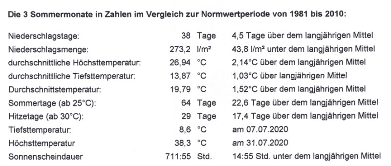 Der Juli 2020 als 14. zu warmer Monat in Folge brachte uns gegenüber der Norm von 1981 – 2010 bei einem Niederschlagsdefizit von 91,2 l/m² einen Temperaturüberschuss von 1,6°C und die Sonne schien 30 Stunden über dem Julisoll.