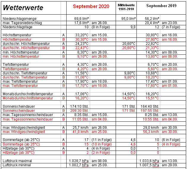 Bis zum 25. lag der erste 25,4 l/m² zu trockene und 38,5 Std. zu sonnenscheinreiche Herbstmonat noch klar auf Temperatur-Rekordniveau (seit Messbeginn 1966), dann wurde er durch die eingeflossene Kaltluft mit einem Temperaturüberschuss von 2,6°C hinter den Septembern 2016, 2018 und 1987 auf den 4. Platz gesetzt. Somit ist der September der 16. zu warme Monat in Folge.