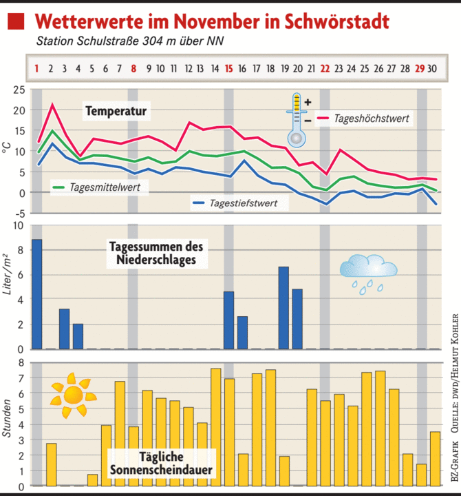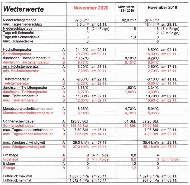 Der „Goldene Oktober“ fand dieses Jahr im November statt, denn noch nie seit Messbeginn 1966 war ein November so sonnig. Der 1,7°C zu warme letzte Herbstmonat lag mit 128,5 Sonnenscheinstunden 67,5 Std. (211%) über dem Soll und mit nur 32,6 l/m² fiel 59,4 l/m² zu wenig Niederschlag.