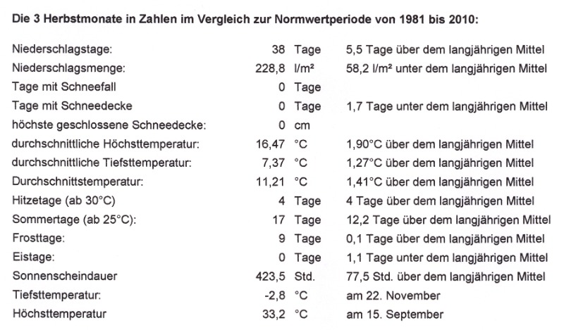 Der im Vergleich zur Normwertperiode von 1981 bis 2010 1,7°C zu warme letzte Herbstmonat lag mit 128,5 Sonnenscheinstunden 67,5 Std. (211%) über der Norm und mit nur 32,6 l/m² fiel nur 35% des Novembersolls.
