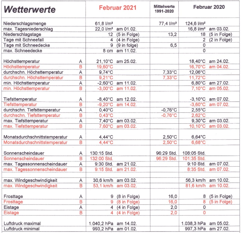 Mit den Tiefs „Reinhard“ und „Siegbert“ startete der letzte Wintermonat warm, windig und sehr niederschlagsreich. Innerhalb der ersten 3 Februartage regnete es mit 43,6 l/m² schon 66% des normalen Februarniederschlages. Vom 4. bis zum 6. Februar machte der Regen eine Verschnaufpause. Nachdem am 7. nochmals 2,4 l/m² Regen fiel stellte die Wetterlage auf Winter um. Bei täglichen Schneeschauern oder leichtem Schneefall bildete sich bei winterlichen Temperaturen bis zum 10. Februar eine 8 cm hohe Schneedecke. Unter dem Einfluss von Hoch „Gisela“ verzeichneten wir am 11. mit einer Tages-Höchsttemperatur von minus 2,6°C den ersten Eistag des Monats. Die Hochs „Gisela“ und „Helida“ sorgten mit einer nordöstlichen Strömung dafür, dass anhaltend arktische Kaltluft zu uns geführt wurde. Trotz bis zu 9,5 Stunden Sonnenschein stiegen die Tagestemperaturen bis einschließ-lich 14. Februar nicht in den positiven Bereich und in den sternenklaren Nächten gab es Nachtfröste um minus 8°C. Nach einer 3.9°C zu warmen ersten Februarwoche zeigte sich die erste Februarhalbzeit nach der zurückliegenden Hochwinterwoche 0,9°C zu kalt mit 58,8 l/m² fiel schon 76% des normalen Februarniederschlages und die Sonne zeigte sich an 34 Std. erst 35% des Februarsolls. Zum Start in die zweite Februarhälfte beendeten die Tiefs “Arvin“ und „Belrem“ die Kältewelle und starteten zugleich mit deutlich milderen und feuchten Luftmassen eine vorfrühlings-hafte Wärmewelle. Ab dem 16. Februar stiegen die Tagestemperaturen wieder deutlich in den zweistelligen Bereich und nach 4 l/m² Regen schien die Sonne ab dem 20. unter dem Einfluss von Hoch „Ilonka“ von früh bis spät. Die süd- bis südwestliche Strömung aus Westafrika hatte neben den warmen Luftmassen auch noch viel Saharastaub an Bord. Das machte sich ab dem 22. hauptsächlich durch fahles, rötlich erscheinendes Sonnenlicht und einige Wolkenfelder bemerkbar. Am 25. Februar stieg die Temperatur mit 21,1°C auf die höchste Februartemperatur seit Messbeginn 1997 an und wir registrierten den ersten warmen Tag (ab 20°C) des Jahres. An den letzten beiden weiterhin sehr sonnigen und niederschlagsfreien Februartagen gingen die Temperaturen mit den nord-westlichen Luftmassen von Hoch „Jacqueline“ auf für die Jahreszeit normale Temperaturen zurück.