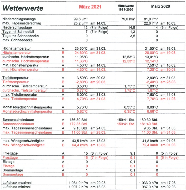 Das aus dem Februar bekannte Hoch „Jacqueline“ sorgte für einen frühlingshaft-sonnigen und mit Saharastaub angereicherten Monatsbeginn. Nach 12 niederschlagsfreien Tagen in Folge brachte uns Tief „Friedrich“ am 4. März 6,4 l/m² Regen. Sternenklare Nachtfröste bis –3,5°C und sehr sonnige Tagestemperaturen bis gegen 12°C; mit diesen „Yoyo“-Temperaturen übernahm Hoch „Kesja“ ab dem 6. das Wetterzepter und bescherte uns bis zum 11. weitere niederschlagsfreie Tage. Ab dem 11. waren die Tage des Hochdruckwetters gezählt, denn mit Sturmtief „Klaus“ standen uns die ersten windigen bis stürmischen Tage des Jahres ins Haus. Der erste Schnellläufer brachte uns am 11. März neben Böen bis 63 km/h auch 16,8 l/m² Regen. Nach dem Sturm ist vor dem Sturm, so könnte man die Folgetage beschreiben. Am 12. 51,5 km/h, am 13. 64,4 km/h und am 14. und 15. sorgte Sturmtief „Luis“ noch für Böen um 42 km/h. Mit „Luis“ kamen auch kühle Luftmasse subpolaren Ursprungs zu uns, die für Niederschläge in Form von zum Teil heftigen Schnee- und Graupelschauern sorgten. Nach diesen stürmischen, niederschlagsreichen und kühlen Tagen zeigte sich die erste Märzhalbzeit 1,2°C zu kalt, mit 81 l/m² fiel schon 102% des normalen Märzniederschlages und die Sonne zeigte sich an 72 Stunden 45% des Märzsolls. Auch der Start in die zweite Monatshalbzeit stand unter dem Zeichen des Märzwinters, denn mit kühlen Temperaturen, Graupel- Schnee- und Schneeregenschauern zeigte sich das Wetter in Anbetracht des Temperaturniveaus spätwinterlich denn frühlingshaft. Zum kalendarischen Frühlingsbeginn am 20. März hatten wir mit -3,5°C die tiefste Temperatur des Monats. Vom 23. bis zum 26. sorgte Hoch „Margarethe“ mit weiteren Nachtfrösten aber steigenden Tages-Temperaturen für sehr viel Sonnenschein. Nach 8 Frosttagen und 6 niederschlagsfreien Tagen in Folge sorgte Tief „Quasimodo“ am 26. und 27. März frostfrei mit 9,6 l/m² Regen für den letzten Niederschlag des Monats. Ab dem 28. startete der Frühling mit dem mächtigen Hoch „Nicole“ richtig durch. Mit Sonnenschein von früh bis spät knackten wir am 29. mit 21,5°C zum ersten Mal in diesem Monat die 20 Gradmarke. Diese frühsommerliche Temperatur wurde am 30. mit 23,7°C deutlich übertroffen und am 31. registrierten wir mit 25,6°C den frühesten ersten Sommertag (ab 25°C) eines Jahres und die höchste Temperatur seit dem 22. Oktober 2020.