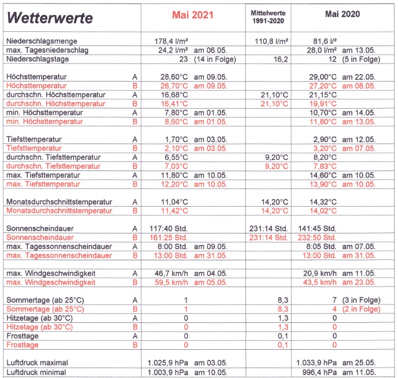 Neben Corona verdarb hauptsächlich Tief „Christian“ mit Regen und kühlen Temperaturen den Maibummlern die Stimmung. Anstatt kurze Hosen und T-Shirt waren an diesem 1. Mai bei einer Höchsttemperatur von 7,8°C und 15,4 l/m² Regen Winterkleidung und Regenschutz angesagt. Nach einem abendlichen Gewitter am 2. sorgte Zwischenhoch „Trudi“ am 3. vorübergehend für eine Wetterberuhigung. Am 4. und 5. sorgte Sturmtief „Eugen“ mit Böen um 60 km/h, Regenschauern und maritimer Kaltluft für herbstlich anmutendes Wetter im Wonnemonat Mai. Auf „Eugen“ folgte Tief „Gregor“, so hielt sich bis zum 8. das typische Aprilwetter mit einigen Schauern und kurzen Gewittern. Petrus hatte ein Herz für die Mütter und schickte uns zur Wetterbesserung Hoch „Utine“. Nachdem am Samstag die Temperatur mit viel Sonnenschein schon auf 20,6°C anstieg, schien die Sonne am Muttertag dem 9. Mai von früh bis spät und mit 28,6°C gab es neben einem weiteren Sommertag (ab 25°C) die bisher höchste Temperatur des Jahres. Nach diesem „Muster-Muttertag“ war die kurze Sommerwärme am Montag jedoch schon wieder vorüber, denn Tief „Hubertus“ schob eine feuchte Kaltfront von Westen zu uns. Bis zur Monatsmitte blieb uns das wechselhafte Wachstumswetter erhalten. Trotz den deutlich zu kühlen Tagestemperaturen blieben die Eisheiligen dieses Jahr mit deutlich im Plus liegenden Nachttemperaturen jedoch zahnlos. Die erste Maihalbzeit war somit 4,2°C zu kalt, mit 98 l/m² fiel schon 88% des normalen Mainiederschlages und die Sonne schien an 66 Std. erst 29% des Maisolls. Auch in der zweiten Maihälfte ging es mit Tief „Lothar“ und weiteren Tiefkollegen beständig unbeständig weiter, wobei am 16. Mai der langjährige Mainiederschlag schon um 6 l/m² übertroffen wurde. In der Wetterküche wurde weiterhin kein neues Menü kreiert, Freunde des beständig warmen und sonnigen Frühlingswetters wurden weiterhin auf die Folter gespannt. Am Pfingstwochenende war es tagsüber bei Tages- höchsttemperaturen von 17 bis 19°C wenigstens trocken. Zum Start in die letzte Maiwoche gab es nach Pfingsten unter dem Einfluss von Tief „Nathan“ bei immer noch für die Jahreszeit deutlich zu kühlen Temperaturen wechsel-haftes Aprilwetter. Ab dem 28. übernahm Hoch „Waltraud“ das Wetterzepter und bescherte uns die letzten 4 Maitage nach 14 Niederschlagstagen in Folge wieder trockenes und sonnenscheinreiches Wetter, wobei die Temperaturen bis auf 23,6°C anstiegen. Durch die lebhafte Bise empfand man die Temperaturen jedoch gut 5°C kälter.