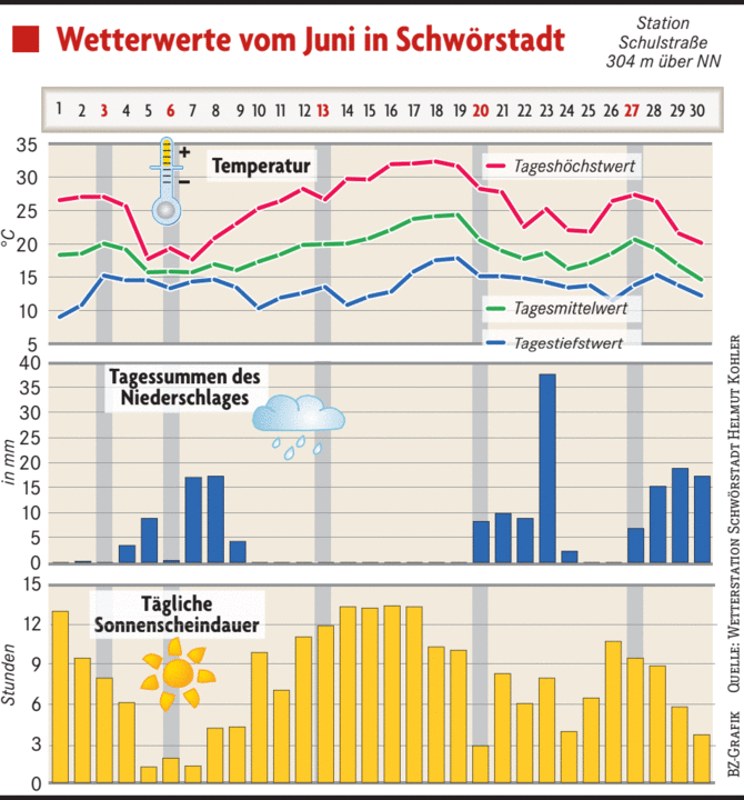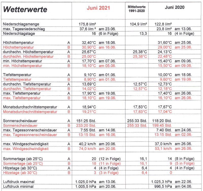 Der erste Sommermonat begann mit Hoch „Waltraut“ standesgemäß wie es sich für den Beginn eines meteorolo-gischen Sommers gehört mit viel Sonnenschein und 4 Sommertagen (ab 25°C) in Folge. Die schwülwarme Luft und Tief „Peter“ sorgten am 4. und 5. Juni für erste Gewitter, wobei am 5. die Temperatur nur noch auf 17,8°C anstieg. Bei weiteren Schauern und Gewittern erhöhte sich der Juniniederschlag bis zum 9. auf 51,2 l/m². Von den zum Teil unwetterartigen Gewittern mit Starkniederschlag, der zu großen Überschwemmungsschäden führte blieben wir jedoch verschont. Unter dem Einfluss von Hoch „Xenia“ stiegen die Tagestemperaturen ab dem 10. mit viel Sonnenschein wieder über 25°C an. Mit 29,8°C am 14. und 29,7°C am 15. verpassten wir den ersten Hitzetag (ab 30°C) des Jahres nur knapp. Somit war die erste Junihalbzeit 0,4°C zu warm, mit 51,2 l/m² fiel 49% des normalen Juniniederschlages und die Sonne schien an 114 Std. 45% des Junisolls. Zu Beginn der zweiten Junihälfte legte der Sommer eine Schippe drauf, denn Hoch „Zoe“ heizte uns kräftig ein. Mit 32,0°C verzeichneten wir am 16. den ersten Hitzetag des Jahres. Auch die folgenden 3 Tage waren Hitzetage, wobei wir am 18. mit 32,4°C die bisher höchste Temperatur des Jahres errichten. In der Meteorologie spricht man von einer Hitzewelle, wenn die Tageshöchsttemperatur gegenüber der Norm über 5 Tage lang um mindestens 5°C überschritten wird, und das war vom 14. bis zum 19. Juni der Fall. Nach dieser ersten Hitzewelle kam am 20. Tief „Ulfert“ ins Spiel und bescherte uns mit schwül-warmer Mittelmeerluft bis zum 24. Gewitter und gewittrige Regenschauer. Am Abend des 23. fiel bei einem Gewitter innerhalb von 20 Minuten 25 l/m² Regen; hierbei wurde um 21 Uhr mit einer kurzfristigen Niederschlagsrate von 217,4 l/m² in der Stunde der stärkste Niederschlag seit dem legendären Unwetter vom 6. Juli 2012 gemessen. Von den zum Teil unwetterartigen Gewittern mit sehr hohem Schadenpotential blieben wir in Schwörstadt verschont. Mit Hoch „Afra“ gab es am 25. und 26. eine vorübergehende, recht sonnige Gewitter-Verschnaufpause. Tief „Xero“ brachte uns ab dem 27. bis zum Monatsende die Gewitterlage zurück, wobei am letzten Junitag die Temperaturen deutlich zurückgingen.